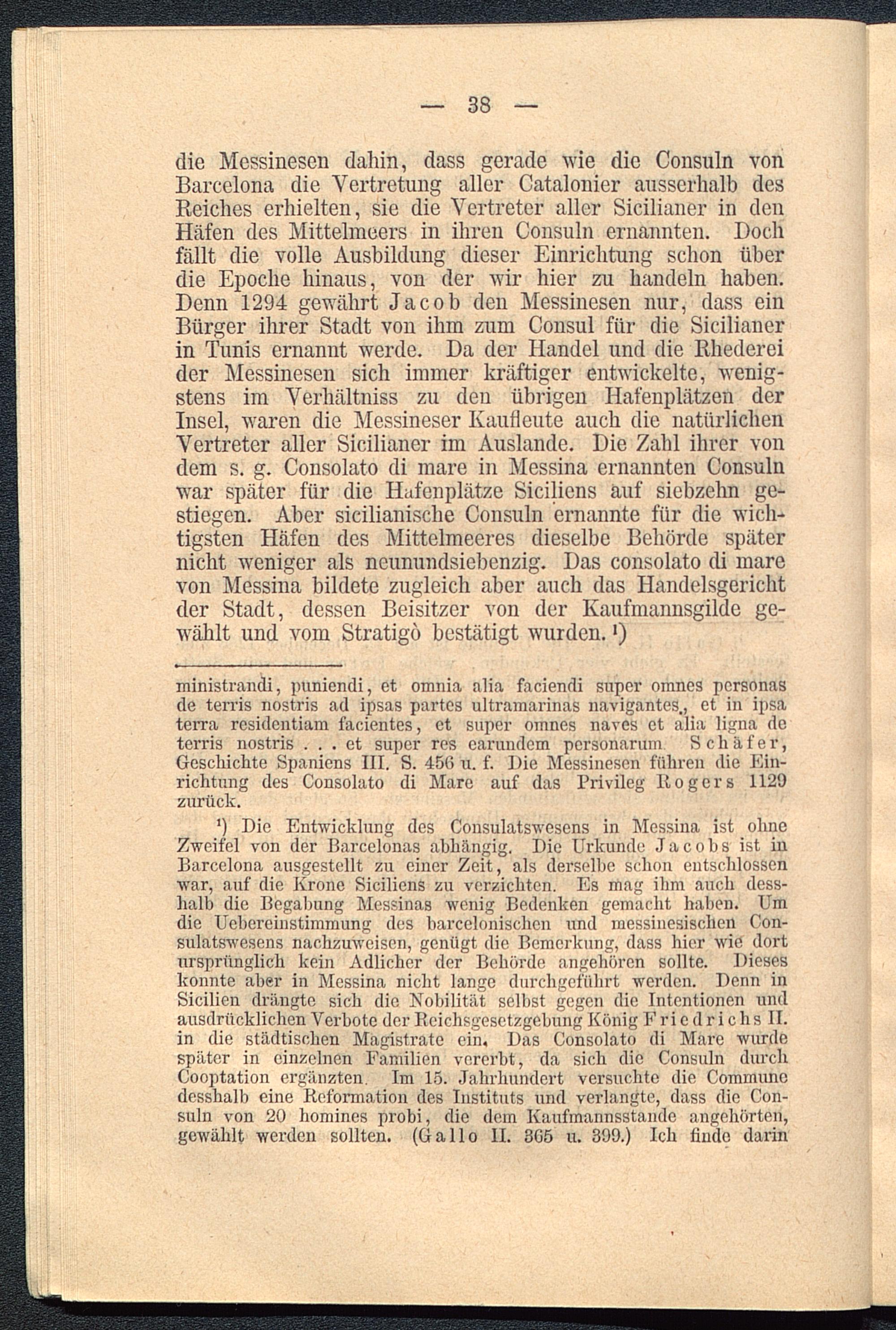 die Messinesen dahin, dass gerade wie die Consuln vonBarcelona die Vertretung aller Catalonier ausserhalb desReiches erhielten, sie die Vertreter aller Sicilianer in denHäfen des Mittelmeers in ihren Consuln ernannten. Dochfällt die volle Ausbildung dieser Einrichtung schon überdie Epoche hinaus, von der wir hier zu handeln haben.Denn 1294 gewährt Jacob den Messinesen nur, dass einBürger ihrer Stadt von ihm zum Consul für die Sicilianerin Tunis ernannt werde. Da der Handel und die Rhedereider Messinesen sich immer kräftiger entwickelte, wenig-stens im Verhältniss zu den übrigen Hafenplätzen derInsel, waren die Messineser Kaufleute auch die natürlichenVertreter aller Sicilianer im Auslande. Die Zahl ihrer vondem s. g. Consolato di mare in Messina ernannten Consulnwar später für die Hafenplätze Siciliens auf siebzehn ge-stiegen. Aber sicilianische Consuln ernannte für die wich-tigsten Häfen des Mittelmeeres dieselbe Behörde späternicht weniger als neunundsiebenzig. Das consolato di marevon Messina bildete zugleich aber auch das Handelsgerichtder Stadt, dessen Beisitzer von der Kaufmannsgilde ge-wählt und vom Stratigö bestätigt wurden.')