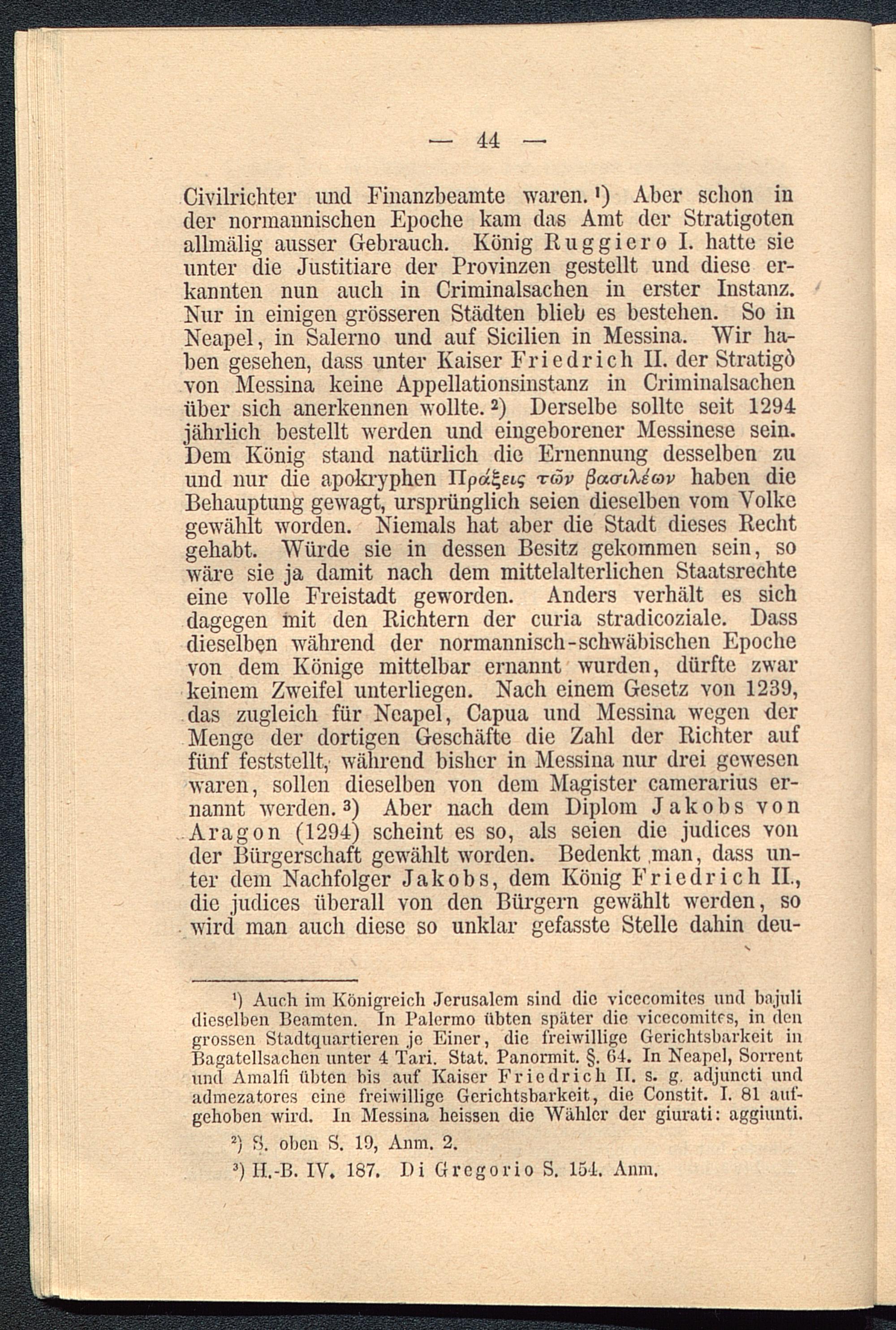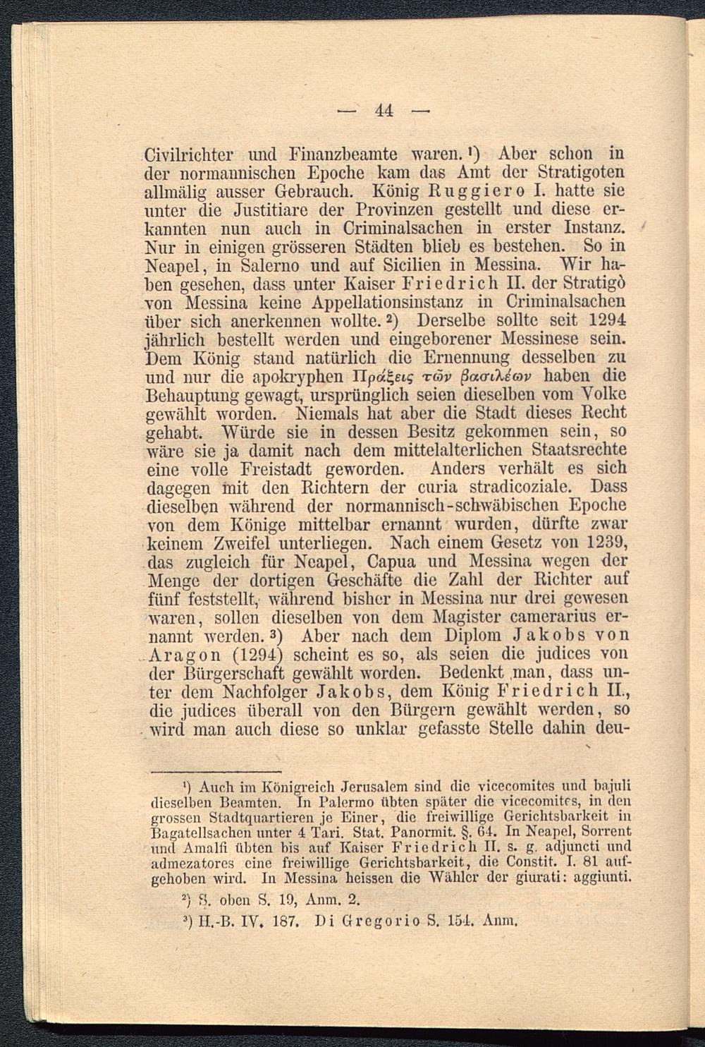 Civilrichter und Finanzbeamte waren.') Aber schon inder normannischen Epoche kam das Amt der Stratigotenallinälig ausser Gebrauch. König Ruggicro I. hatte sieunter die Justitiare der Provinzen gestellt und diese er-kannten nun auch in Criminalsachen in erster Instanz.Kur in einigen grösseren Städten blieb es bestehen. So inNeapel, in Salerno und auf Sicilien in Messina. Wir ha-ben gesehen, dass unter Kaiser Friedrich II. der Stratigövon Messina keine Appellationsinstanz in Criminalsachenüber sich anerkennen wollte. 2 ) Derselbe sollte seit 1294jährlich bestellt werden und eingeborener Messinese sein.Dem König stand natürlich die Ernennung desselben zuund nur die apokryphen npdijei; w ßacrikiav haben dieBehauptung gewagt, ursprünglich seien dieselben vom Volkegewählt worden. Niemals hat aber die Stadt dieses Rechtgehabt. Würde sie in dessen Besitz gekommen sein, sowäre sie ja damit nach dem mittelalterlichen Staatsrechteeine volle Freistadt geworden. Anders verhält es sichdagegen mit den Richtern der curia stradicoziale. Dassdieselben während der normannisch -schwäbischen Epochevon dem Könige mittelbar ernannt wurden, dürfte zwarkeinem Zweifel unterliegen. Nach einem Gesetz von 1239,das zugleich für Neapel, Capua und Messina wegen derMenge der dortigen Geschäfte die Zahl der Richter auffünf feststellt, während bisher in Messina nur drei gewesenwaren, sollen dieselben von dem Magister camerarius er-nannt werden. 3 ) Aber nach dem Diplom Jakobs vonAragon (1294) scheint es so, als seien die judices vonder Bürgerschaft gewählt worden. Bedenkt inan, dass un-ter dem Nachfolger Jakobs, dem König Friedrich II.,die judices überall von den Bürgern gewählt werden, sowird man auch diese so unklar gefasste Stelle dahin deu-