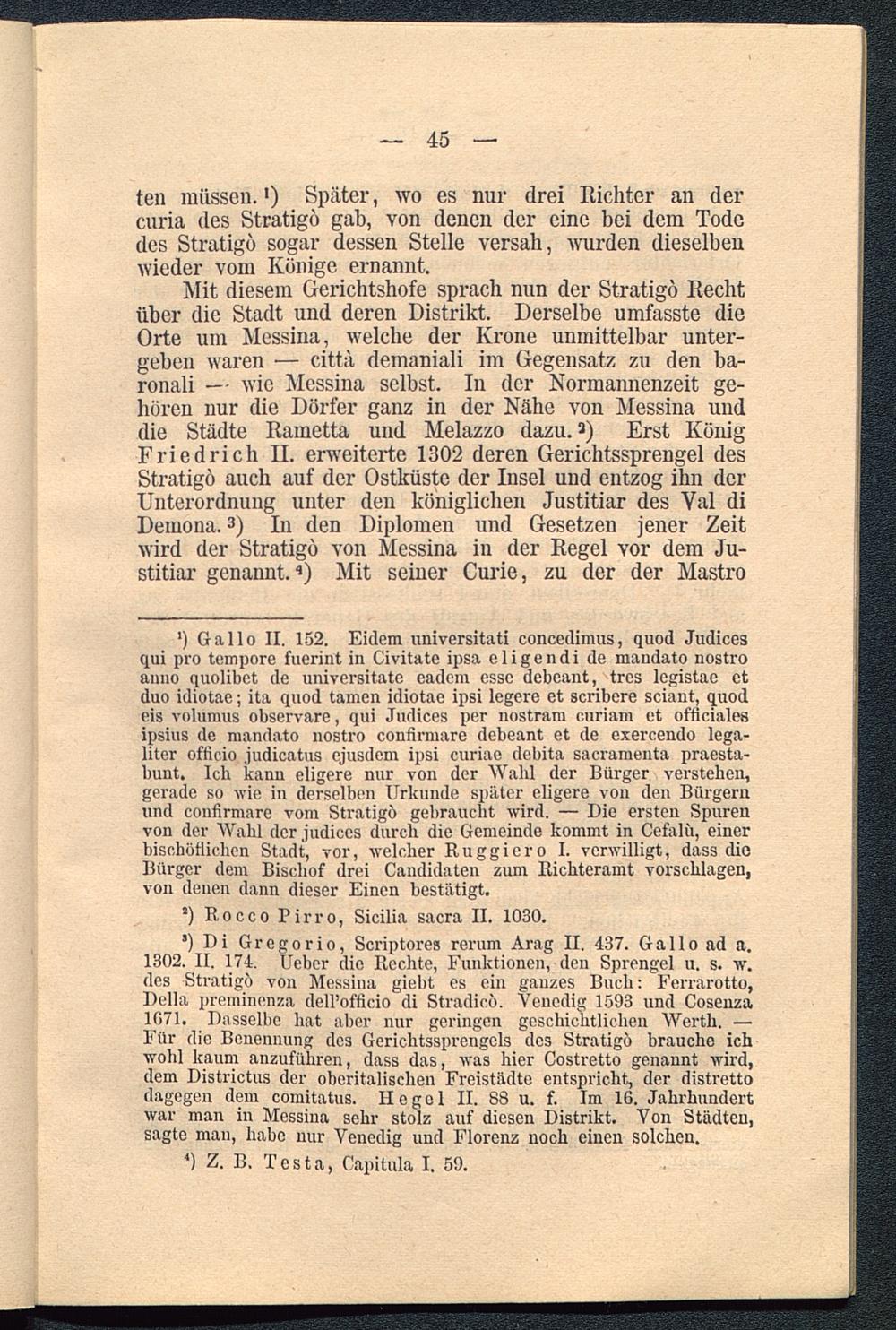 Mit diesem Gerichtshöfe sprach nun der Stratigö Rechtüber die Stadt und deren Distrikt. Derselbe umfasste dieOrte um Messina , welche der Krone unmittelbar unter-geben waren — cittä demaniali im Gegensatz zu den ba-ronali — wie Messina selbst. In der Normannenzeit ge-hören nur die Dörfer ganz in der Nähe von Messina unddie Städte Rametta und Melazzo dazu. * 2 ) Erst KönigFriedrich II. erweiterte 1302 deren Gerichtssprengel desStratigö auch auf der Ostküste der Insel und entzog ihn derUnterordnung unter den königlichen Justitiar des Val diDemona. 3 ) In den Diplomen und Gesetzen jener Zeitwird der Stratigö von Messina in der Regel vor dem Ju-stitiar genannt. 4 ) Mit seiner Curie, zu der der Mastro