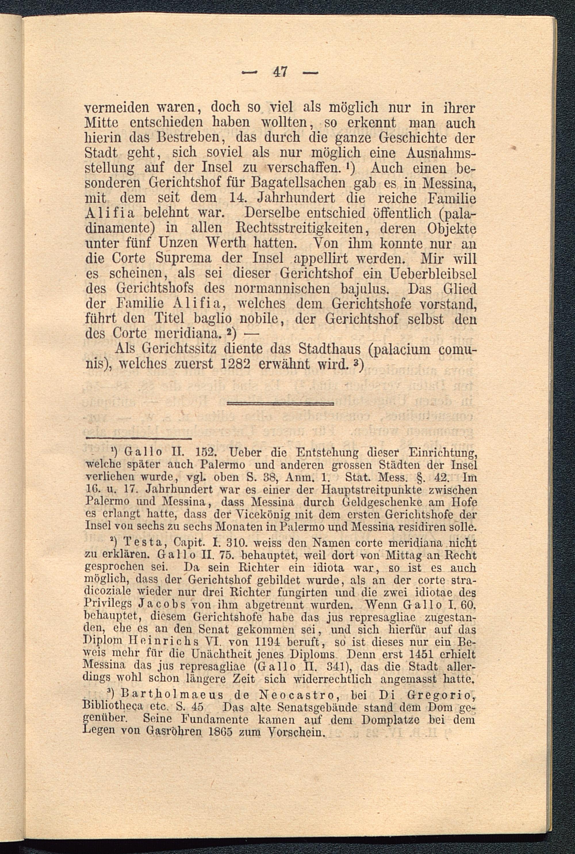 ') Gallo II. 152. Ueber die Entstehung dieser Einrichtung,welche später auch Palermo und anderen grossen Städten der Inselverliehen wurde, vgl. oben S. 38, Anm. 1. Stat. Mess. §. 42. ImIG. u. 17. Jahrhundert war es einer der Hauptstreitpunkte zwischenPalermo und Messina, dass Messina durch Geldgeschenke am Hofees erlangt hatte, dass der Yicekönig mit dem ersten Gerichtshöfe derInsel von sechs zu sechs Monaten in Palermo und Messina residiren solle.