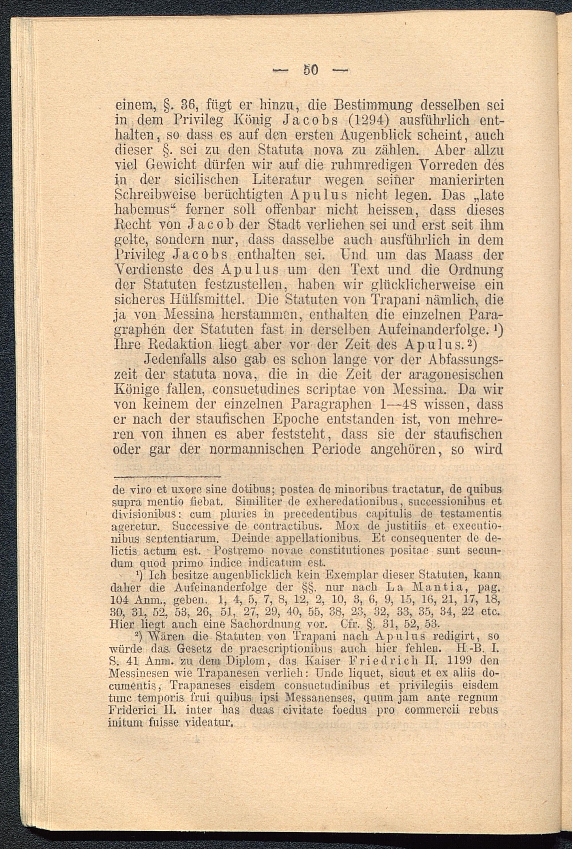 einem, §. 36, fügt er hinzu, die Bestimmung desselben seiin dem Privileg König Jacobs (1294) ausführlich ent-halten , so dass es auf den ersten Augenblick scheint, auchdieser §. sei zu den Statuta nova zu zählen. Aber allzuviel Gewicht dürfen wir auf die ruhmredigen Vorreden desin der sicilischen Literatur wegen seiner manierirtenSchreibweise berüchtigten Apulus nicht legen. Das „latehabenius“ ferner soll offenbar nicht heissen, dass diesesliecht von Jacob der Stadt verliehen sei und erst seit ihmgelte, sondern nur, dass dasselbe auch ausführlich in demPrivileg Jacobs enthalten sei. Und um das Maass derVerdienste des Apulus um den Text und die Ordnungder Statuten festzustellen, haben wir glücklicherweise einsicheres Ilülfsmittel. Die Statuten von Trapani nämlich, dieja von Messina herstammen, enthalten die einzelnen Para-graphen der Statuten fast in derselben Aufeinanderfolge.')Ihre Kedaktion liegt aber vor der Zeit des Apulus. * 2 )