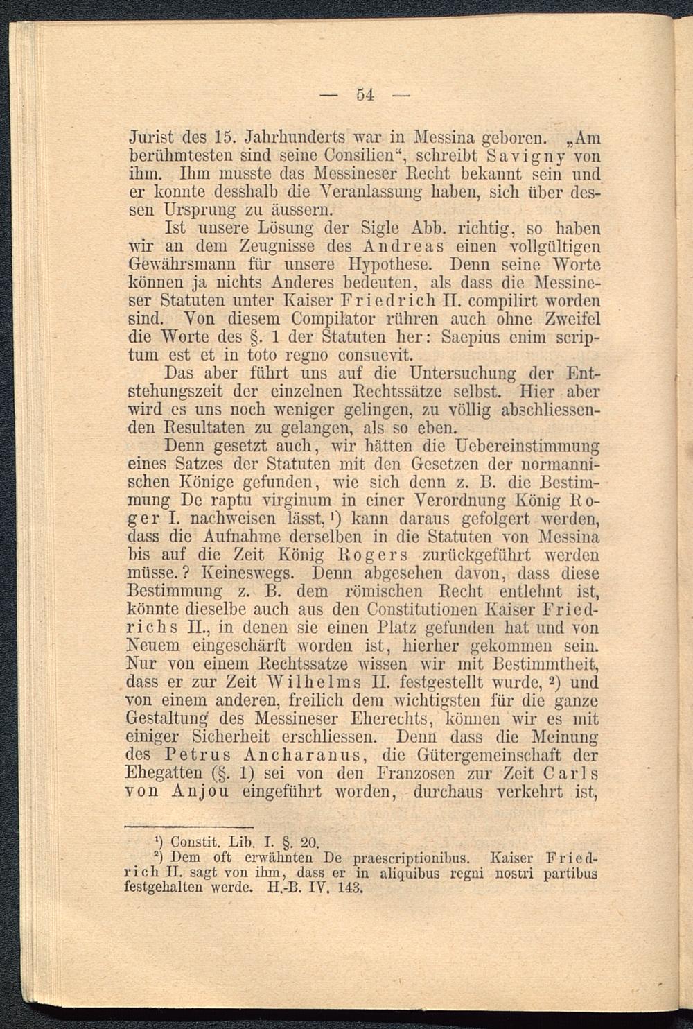 Denn gesetzt auch, wir hätten die Uebereinstinunungeines Satzes der Statuten mit den Gesetzen der normanni-schen Könige gefunden, wie sich denn z. R. die Restim-mung De raptu virginum in einer Verordnung König Ro-ger I. nachweisen lässt, 1 ) kann daraus gefolgert werden,dass die Aufnahme derselben in die Statuten von Messina bis auf die Zeit König Rogers zurückgeführt werdenmüsse. ? Keineswegs. Denn abgesehen davon, dass dieseRestimmung z. R. dem römischen Recht entlehnt ist,könnte dieselbe auch aus den Constitutionen Kaiser Fried-richs II., in denen sie einen Platz gefunden hat und vonNeuem eingeschärft worden ist, hierher gekommen sein.Nur von einem Rechtssatze wissen wir mit Restinnntheit,dass er zur Zeit Wilhelms II. fcstgestellt wurde, 2 ) undvon einem anderen, freilich dem wichtigsten für die ganzeGestaltung des Messineser Eherechts, können wir es miteiniger Sicherheit erschliessen. Denn dass die Meinungdes Petrus Ancharanus , die Gütergemeinschaft derEhegatten (g. 1) sei von den Franzosen zur Zeit Carlsvon Anjou eingeführt worden, durchaus verkehrt ist,