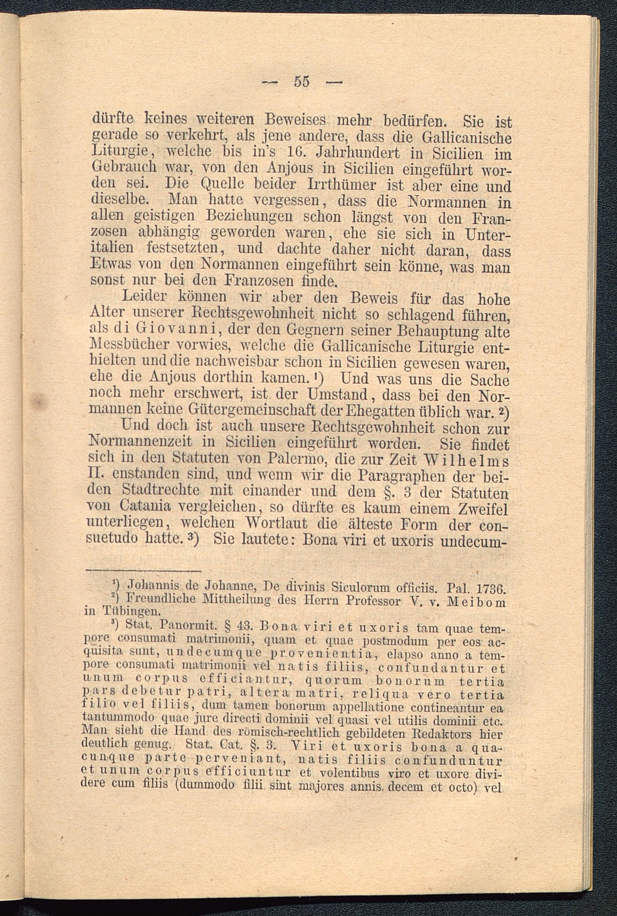 Leider können wir aber den Beweis für das hoheAlter unserer Rechtsgewohnheit nicht so schlagend führen,als d i Giovanni, der den Gegnern seiner Behauptung alteMessbücher vorwies, welche die Gallicanische Liturgie ent-hielten und die nachweisbar schon iu Sicilien gewesen waren,ehe die Anjous dorthin kamen.') Und was uns die Sachenoch mehr erschwert, ist der Umstand, dass bei den Nor-mannen keine Gütergemeinschaft der Ehegatten üblich war. * 2 )