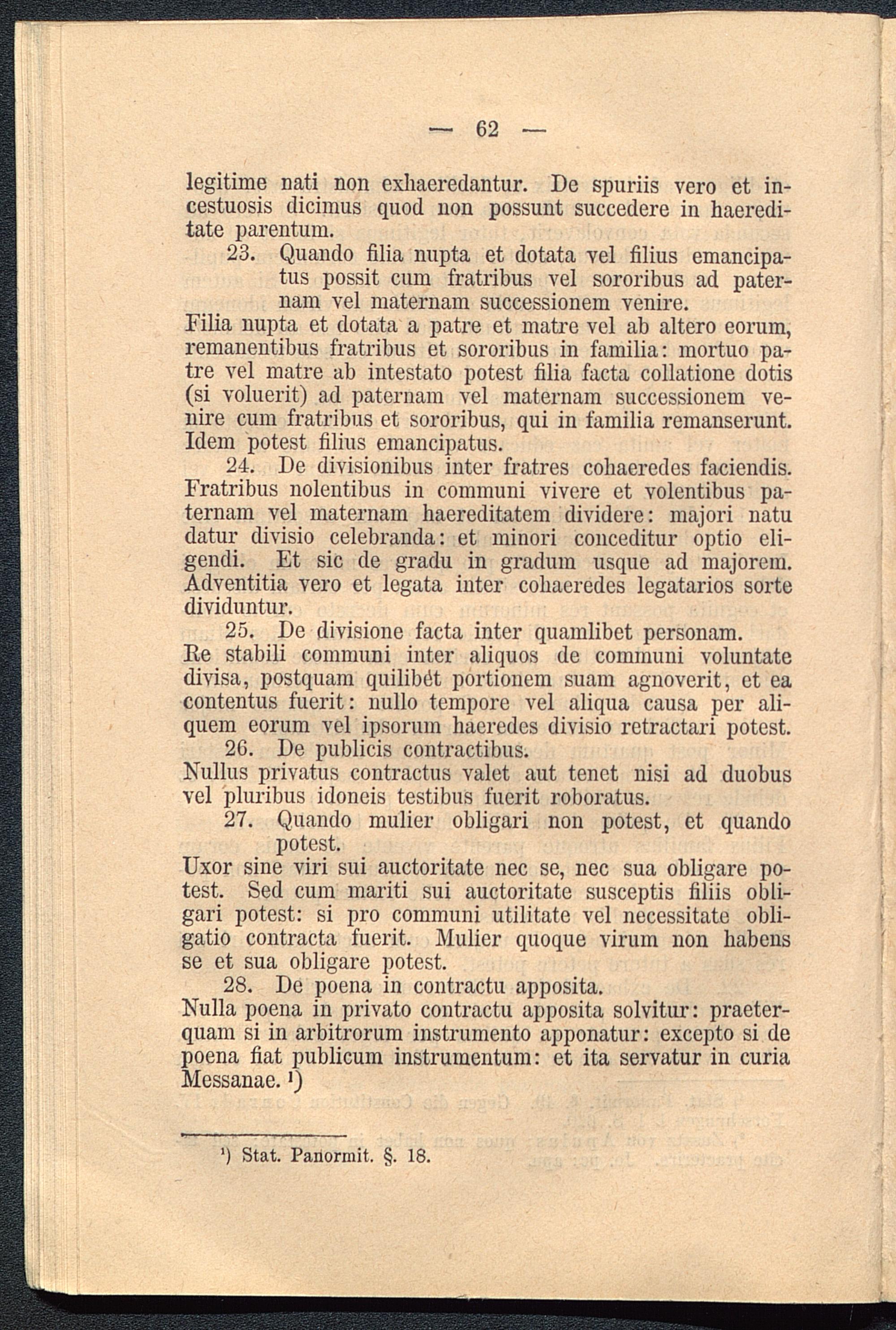 24. De divisionibus inter fratres cohaeredes faciendis.Fratribus nolentibus in communi vivere et volentibus pa-ternam vel maternam haereditatem dividere: majori natudatur divisio celebranda: et minori conceditur optio eli-gendi. Et sic de gradu in graduin usque ad majorem.Adventitia vero et legata inter cobaeredes legatarios Sortedividuntur.
