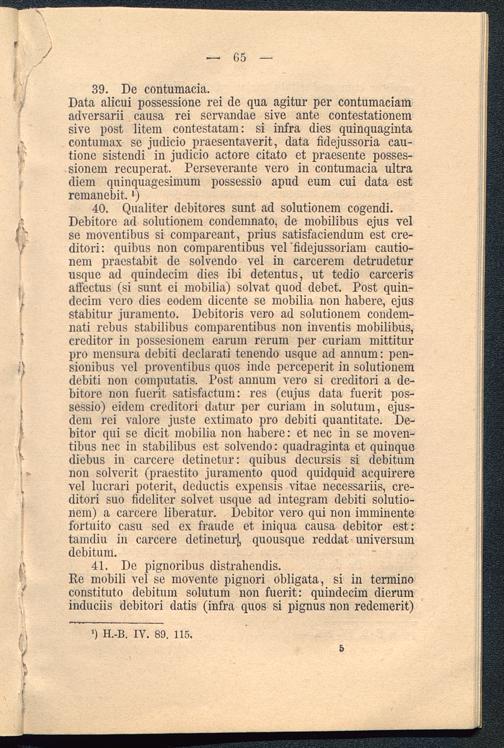 40. Qualiter debitores sunt ad solutionem cogendi.Debitore ad solutionem condemnato, de mobilibus ejus Telse moventibus si compareant, prius satisfaciendum est cre-ditori: quibus non comparentibus vel 'fidejussoriam cautio-nem praestabit de solvendo vel in carcerem detrudeturusque ad quindecim dies ibi detentus, ut tedio carcerisaffectus (si sunt ei mobilia) solvat quod debet. Post quin-decim vero dies eodem dicente se mobilia non habere, ejusstabitur juramento. Debitoris vero ad solutionem condem-nati rebus stabilibus comparentibus non inventis mobilibus,crcditor in possesionem earum rerum per curiam mittiturpro mensura debiti declarati tenendo usque ad annum: pen-sionibus vel proventibus quos inde perceperit in solutionemdebiti non computatis. Post annum vero si creditori a de-bitore non fuerit satisfactum: res (cujus data fuerit pos-sessio) eidem creditori datur per curiam in solutum, ejus-dem rei valore juste extimato pro debiti quantitate. De-bitor qui sc dicit mobilia non liabere: et nec in se moven-tibus nec in stabilibus est solvendo: quadraginta et quinquediebus in carcere detinetur: quibus decursis si debitumnon solverit (praestito juramento quod quidquid acquirerevel lucrari poterit, deductis expensis vitae necessariis, cre-ditori suo fideliter solvet usque ad integram debiti solutio-nem) a carcere liberatur. Debitor vero qui non imminentefortuito casu sed ex fraude et iniqua causa debitor est:tamdiu in carcere detineturj, quousque reddat Universumdebitum.