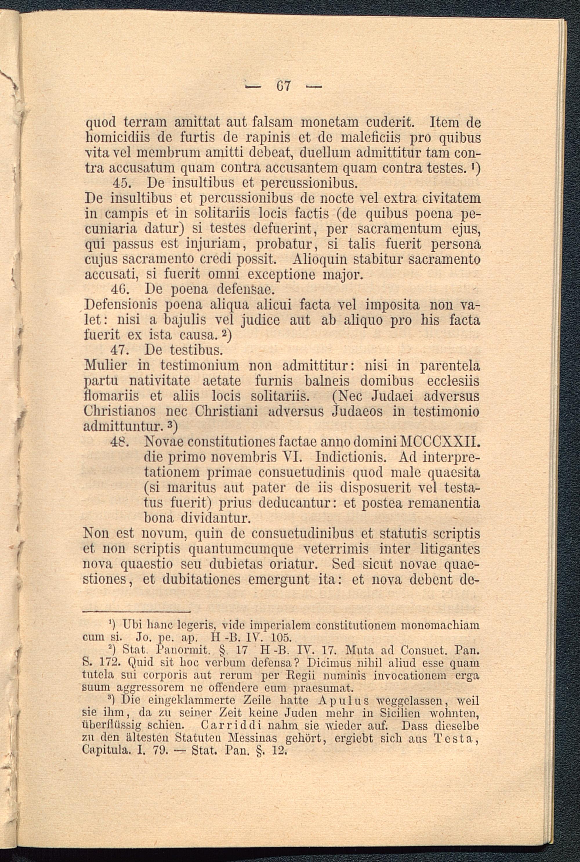3 ) I)ie eingeldammerte Zeile hatte A p u 1 u s veggelassen, veilsie ihm, da zu seiner Zeit keine Juden mehr in Sicilien wohnten,überflüssig schien. Carriddi nahm sie wieder auf. Bass dieselbezu den ältesten Statuten Messinas gehört, ergiebt sich aus Testa,Capitula. I. 79. — Stat. Pan. §. 12.