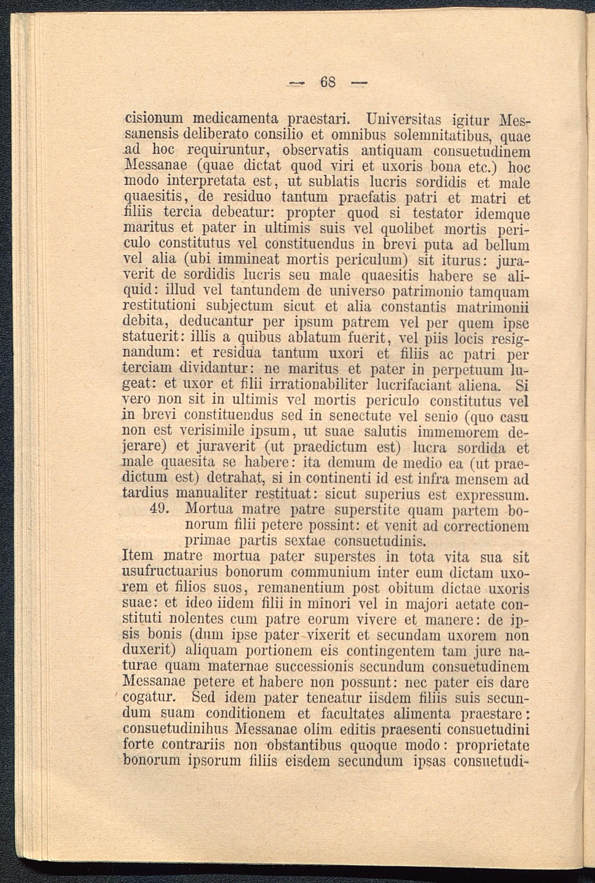 cisionum medicamenta pracstari. Universitas igitur Mes-sanensis deliberato consilio et omnibus solemnitatibiis, quaead lioc requiruntur, observatis antiquam cousuetudinemMessanae (quae dictat quod viri et uxoris bona etc.) hocmodo interpretata est, ut sublatis lucris sordidis et malequaesitis, de residuo tantum praefatis patri et matri etfiliis tercia debeatur: propter quod si testator idemquemaritus et pater in ultimis suis vel quolibet mortis peri-culo constitutus vel constituendus in brevi puta ad bellumvel alia (ubi immineat mortis periculum) sit iturus: jura-verit de sordidis lucris seu male quaesitis habere se ali-quid: illud vel tantundem de universo patrimonio tarn quamrestitutioni subjectuin sicut et alia constantis matrimoniidebita, deducantur per ipsum patrem vel per quem ipsestatuerit: illis a quibus ablatum fuerit, vel piis locis resig-nandum: et residua tantum uxori et filiis ac patri perterciam dividantur: ne maritus et pater in perpetuum lu-geat: et uxor et filii irrationabiliter lucrifaciant aliena. Sivero non sit in ultimis vel mortis periculo constitutus velin brevi constituendus sed in senectute vel senio (quo casunon est verisimile ipsum, ut suae salutis immemorem dc-jerare) et juraverit (ut praedictum est) lucra sordida etmale quaesita se habere: ita demum de medio ea (ut prae-dictum est) detrahat, si in continenti id est infra mensem adtardius manualiter restituat: sicut superius est expressum.