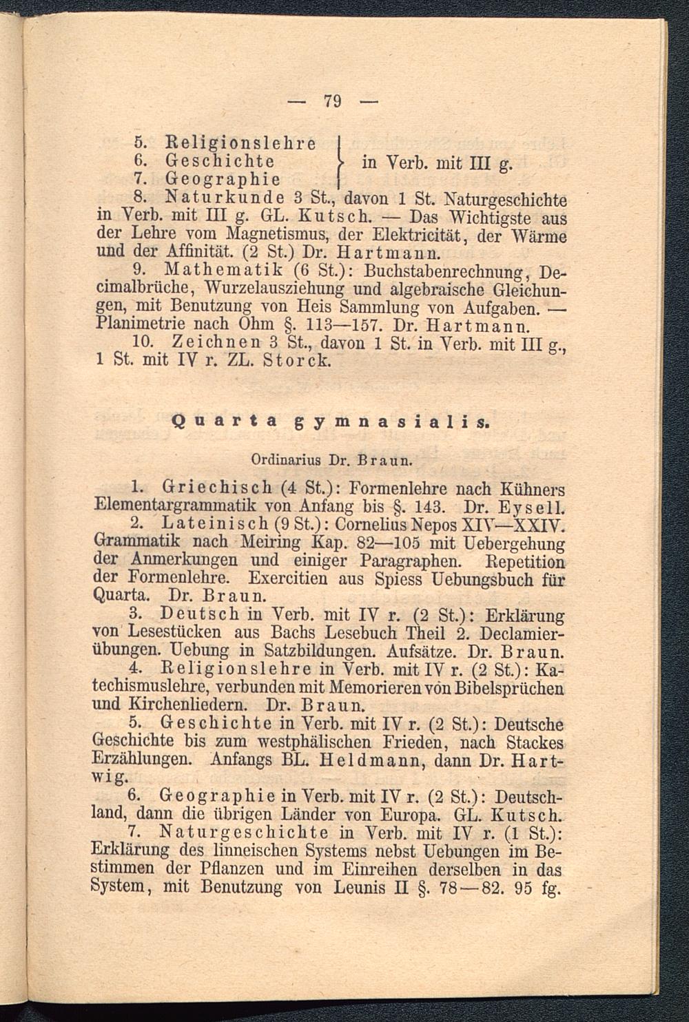 2. L a t e i n i s c h (9 St.): Cornelius Nepos XIV—XXIV.Grammatik nach Meiring Kap. 82—105 mit Uebergehungder Anmerkungen und einiger Paragraphen. Repetitionder Formenlehre. Exercitien aus Spiess Uebungsbuch fürQuarta. Dr. Braun.