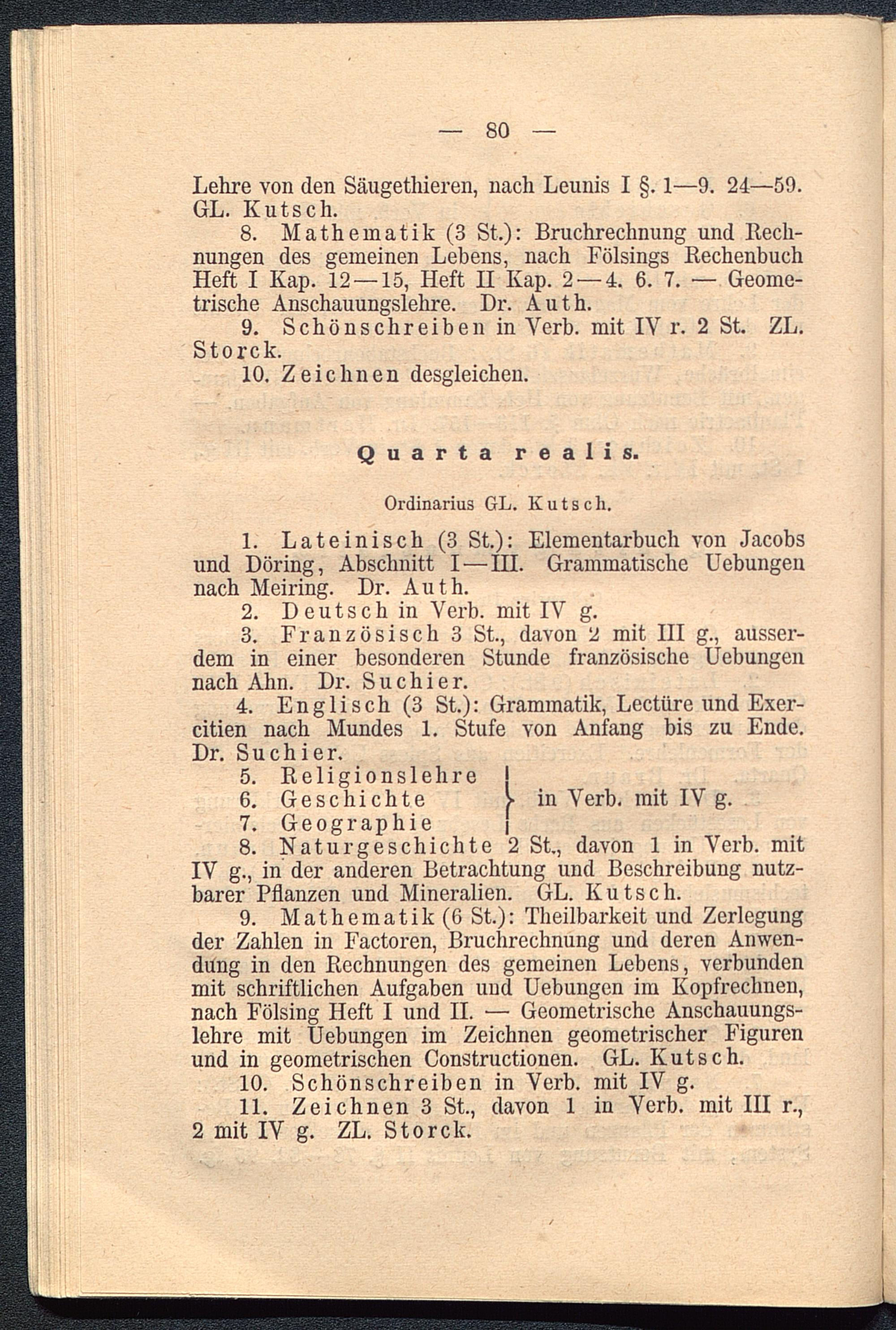 9. Mathematik (6 St.): Theilbarkeit und Zerlegungder Zahlen in Factoren, Bruchrechnung und deren Anwen-dung in den Rechnungen des gemeinen Lebens, verbundenmit schriftlichen Aufgaben und Uebungen im Kopfrechnen,nach Fölsing Heft I und II. — Geometrische Anschauungs-lehre mit Uebungen im Zeichnen geometrischer Figurenund in geometrischen Constructionen. GL. Kutsch.