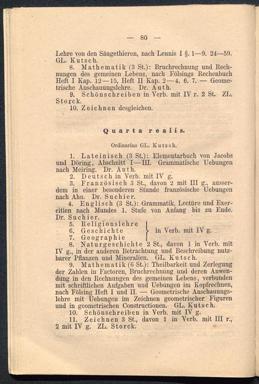 8. Naturgeschichte 2 St., davon 1 in Verb, mitIV g., in der anderen Betrachtung und Beschreibung nutz-barer Pflanzen und Mineralien. GL. Kutsch.