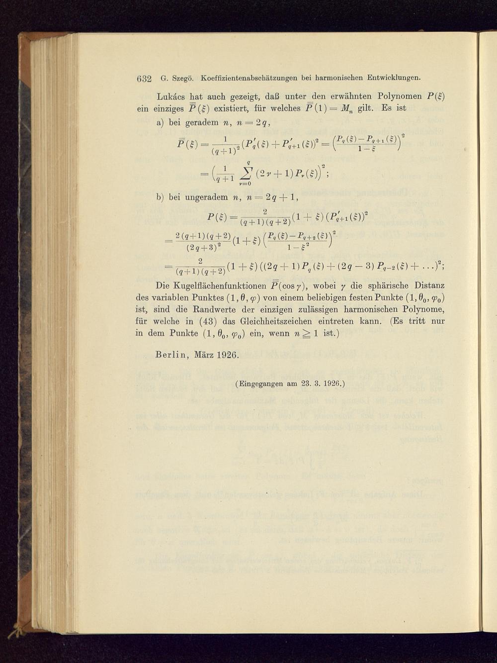G. Szegö: Koeffizientenschätzungen bei ebenen und räumlichen harmonischen Entwicklungen