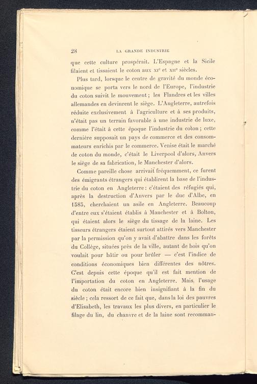 Plus tard, lorsque le centre de gravité du monde éco-nomique se porta vers le nord de l’Europe, l’industriedu coton suivit le mouvement ; les Flandres et les villesallemandes en devinrent le siège. L’Angleterre, autrefoisréduite exclusivement à l’agriculture et à ses produits,n’était pas un terrain favorable à une industrie de luxe,comme l’était à cette époque l’industrie du coton ; cettedernière supposait un pays de commerce et des consom-mateurs enrichis par le commerce. Venise était le marchéde coton du monde, c’était le Liverpool d’alors, Anvers le siège de sa fabrication, le Manchester d’alors.