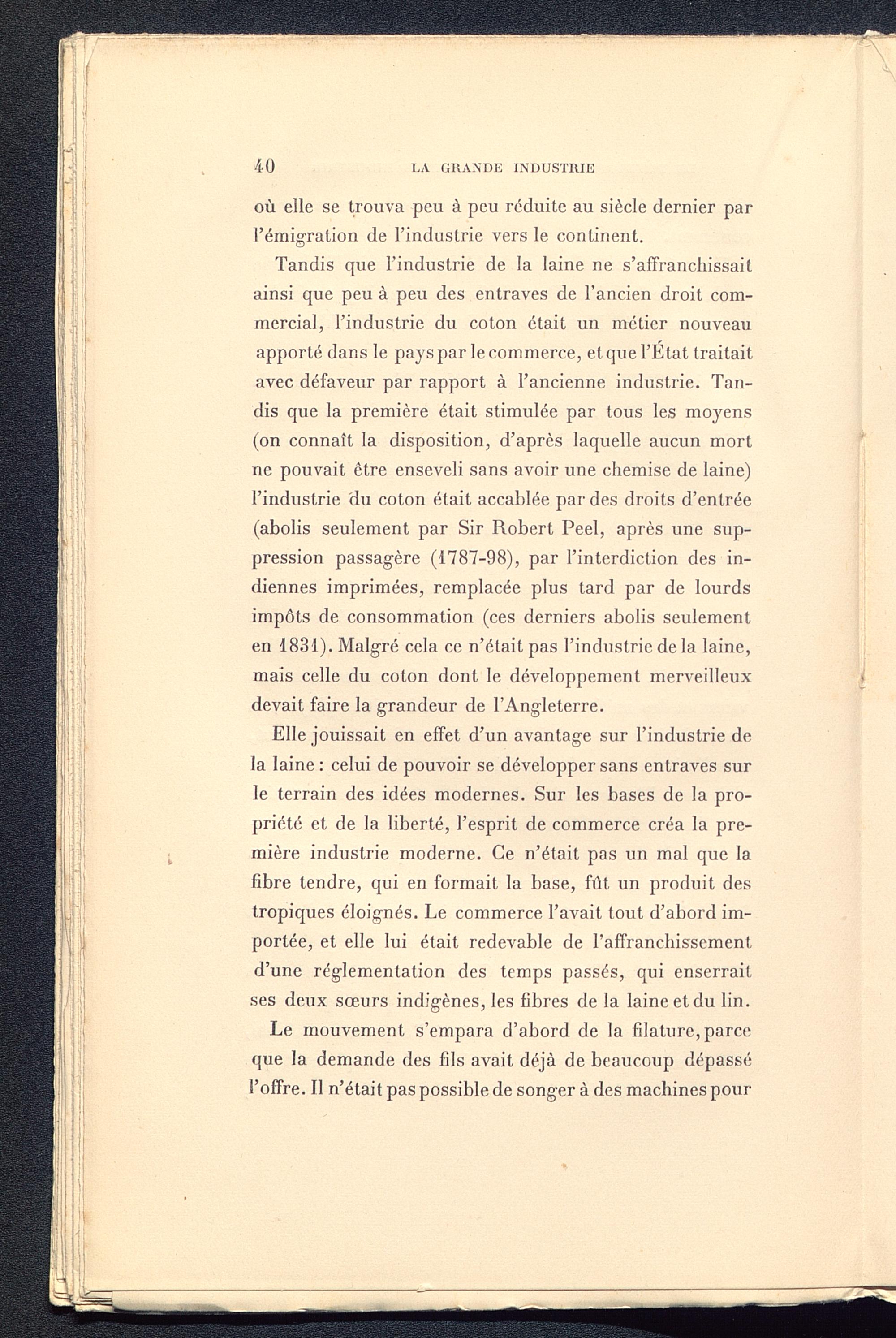 Tandis que l’industrie de la laine ne s’affranchissaitainsi que peu à peu des entraves de l’ancien droit com-mercial, l’industrie du coton était un métier nouveauapporté dans le pays par le commerce, et que l’État traitaitavec défaveur par rapport à l’ancienne industrie. Tan-dis que la première était stimulée par tous les moyens(on connaît la disposition, d’après laquelle aucun mortne pouvait être enseveli sans avoir une chemise de laine)l’industrie du coton était accablée par des droits d’entrée(abolis seulement par Sir Robert Peel , après une sup-pression passagère (1787-98), par l’interdiction des in-diennes imprimées, remplacée plus tard par de lourdsimpôts de consommation (ces derniers abolis seulementen 1831). Malgré cela ce n’était pas l’industrie de la laine,mais celle du coton dont le développement merveilleuxdevait faire la grandeur de l’Angleterre .