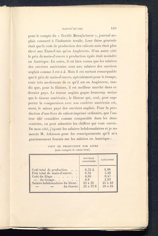 pour le compte du « Textile Manufacturer », journal an-glais consacré à l’industrie textile. Leur thèse généraleétait (pie le coût de production des calicots unis était plusélevé aux Etats-Unis qu’en Angleterre. D’un autre côtéle prix de main-d’œuvre à production égale était moindreen Amérique. En outre, il est bien connu que les salairesdes ouvriers américains sont aux salaires des ouvriersanglais comme 3 est à 2. Mais il est surtout remarquable(pie le prix de main-d’œuvre, spécialement pour le tissage,reste très au-dessous de ce qu’il est en Angleterre, tan-dis que, pour la filature, il est meilleur marché dans cedernier pays. Le tisseur anglais gagne beaucoup moinsque le tisseur américain ; le filateur qui, seul, peut sup-porter la comparaison avec son confrère américain est,aussi, le mieux payé des ouvriers anglais. Pour la pro-duction d’une livre de calicot imprimé ordinaire, que l’au-teur cité considère comme comparable dans les deuxcontrées, on peut admettre les chiffres qui vont suivre.De mon côté, j’ajoute les salaires hebdomadaires et je re-mercie M. Atkinson pour les renseignements qu’il m’agracieusement fournis sur les salaires en Amérique :