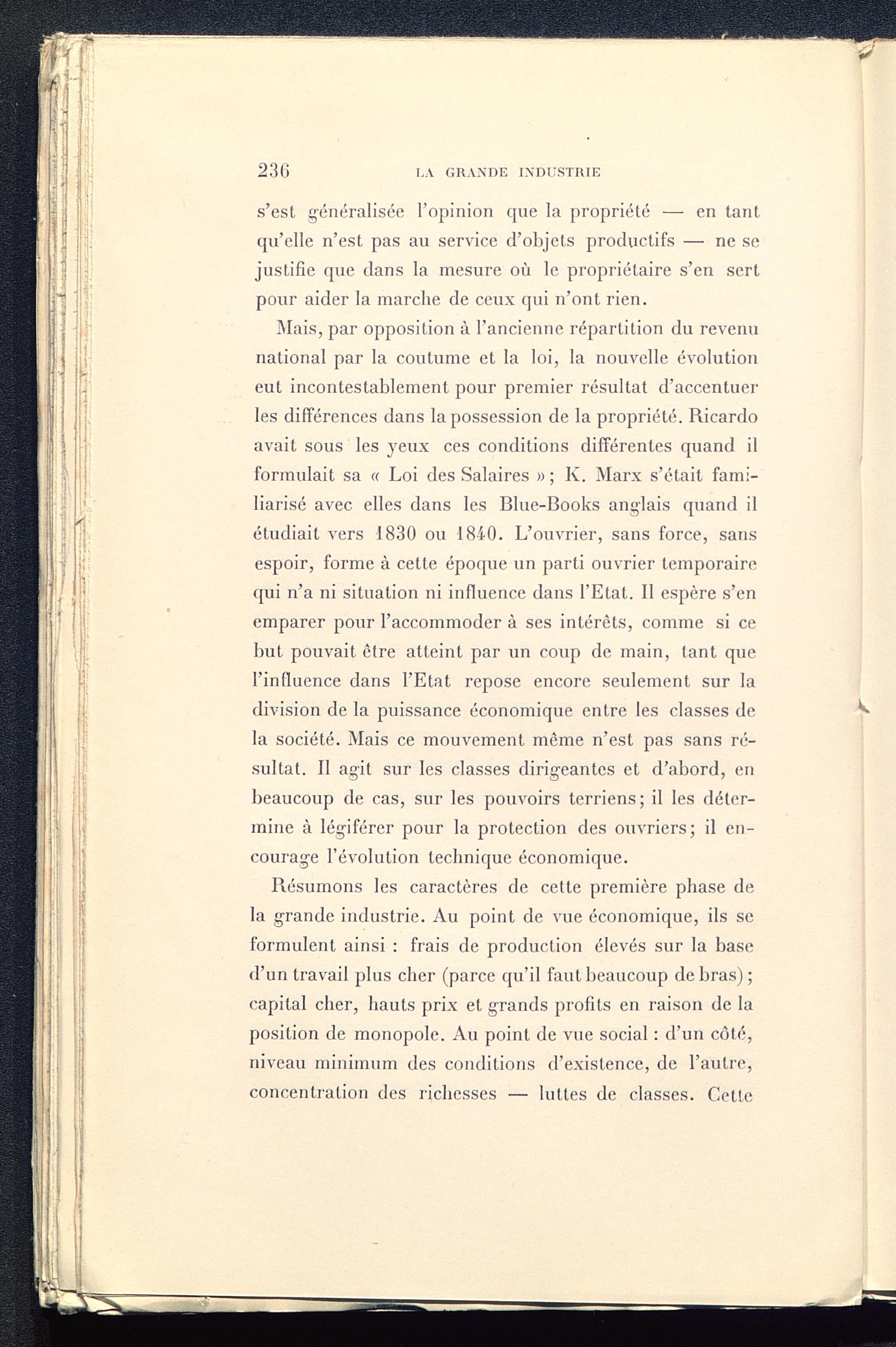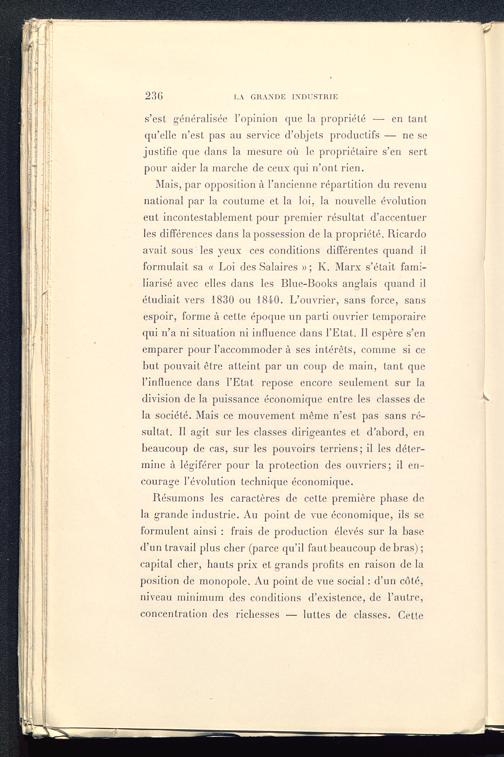 Résumons les caractères de cette première phase dela grande industrie. Au point de vue économique, ils seformulent ainsi : frais de production élevés sur la based’un travail plus cher (parce qu’il faut beaucoup de bras);capital cher, hauts prix et grands profits en raison de laposition de monopole. Au point de vue social : d’un côté,niveau minimum des conditions d’existence, de l’autre,concentration des richesses — luttes de classes. Cette