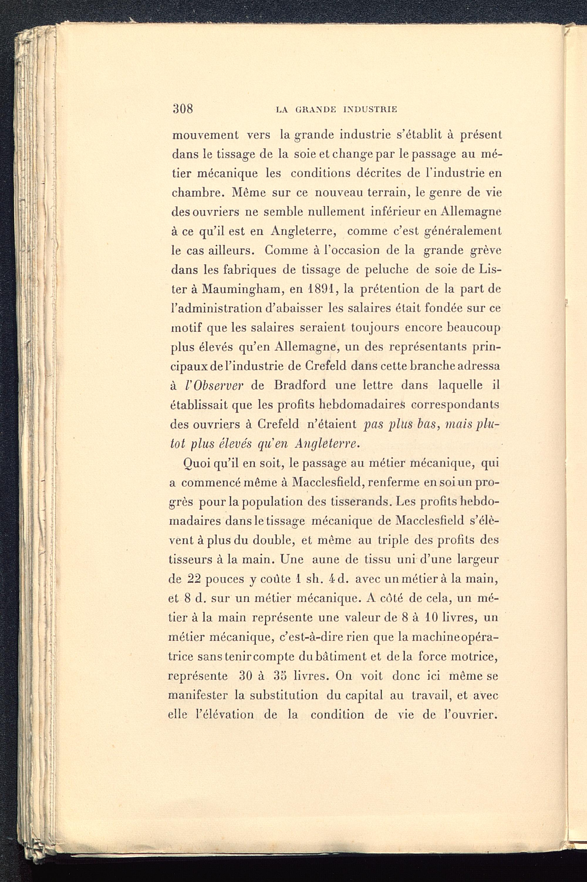 mouvement vers la grande industrie s’établit à présentdans le tissage de la soie et change par le passage au mé-tier mécanique les conditions décrites de l’industrie enchambre. Même sur ce nouveau terrain, le genre de viedes ouvriers ne semble nullement inférieur en Allemagne à ce qu’il est en Angleterre , comme c’est généralementle cas ailleurs. Comme à l’occasion de la grande grèvedans les fabriques de tissage de peluche de soie de Lis-ter à Maumingham, en 1891, la prétention de la part del’administration d’abaisser les salaires était fondée sur cemotif que les salaires seraient toujours encore beaucoupplus élevés qu’en Allemagne , un des représentants prin-cipaux de l’industrie de Crefeld dans cette branche adressaà VObserver de Bradford une lettre dans laquelle ilétablissait que les profits hebdomadaires correspondantsdes ouvriers à Crefeld n’étaient pas plus bas, mais plu-tôt plus élevés qu'en Angleterre.