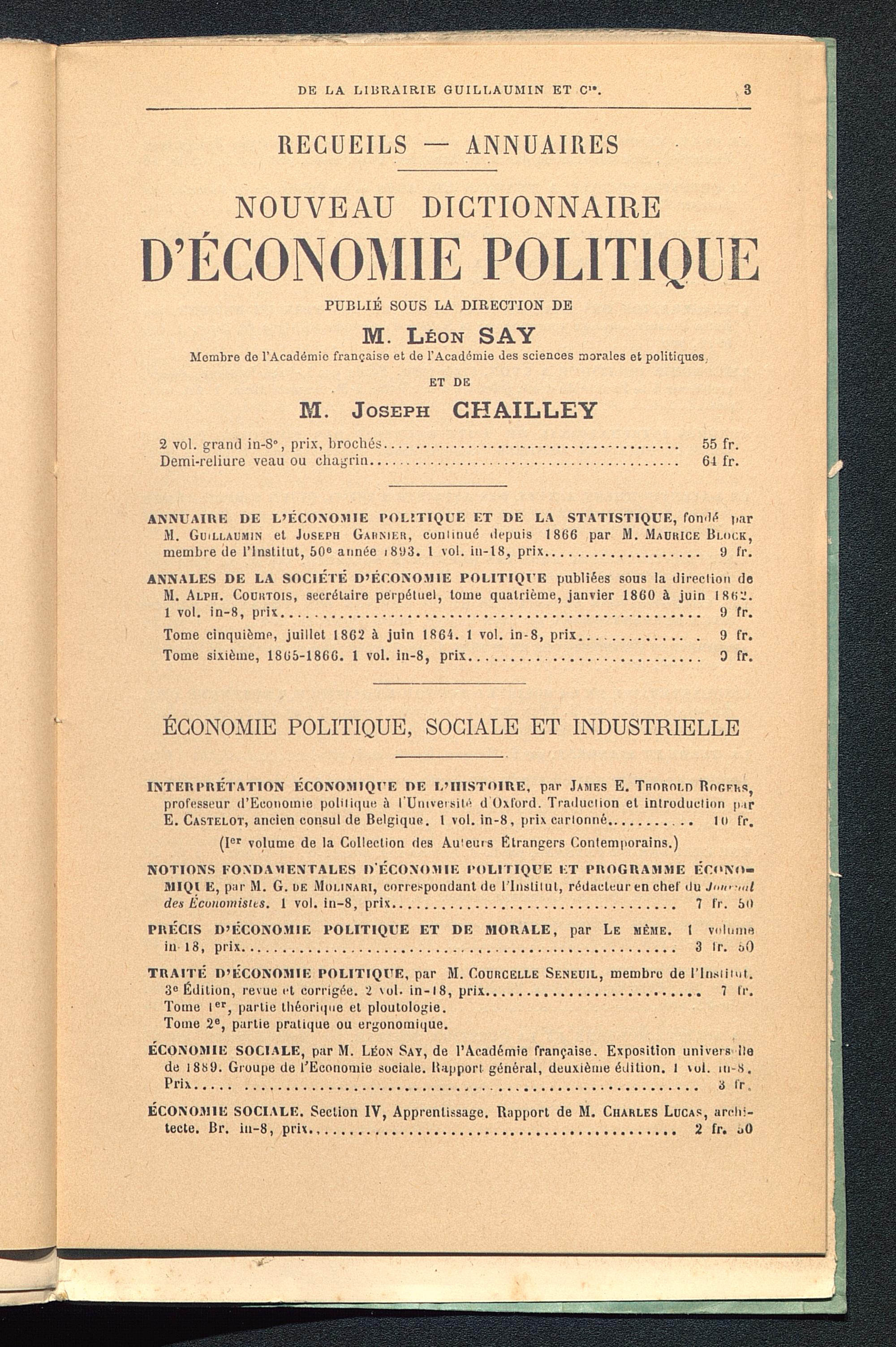 ANNUAIRE DE L’ÉCONOMIE POLITIQUE ET DE LA STATISTIQUE, fondé |,arJl. Guillaumin et Joseph Garnier , commué depuis 1866 par M. Maurice Blocs,membre de l’inslilut, 50® année i893. t vol. in-18, prix. 9 fr.