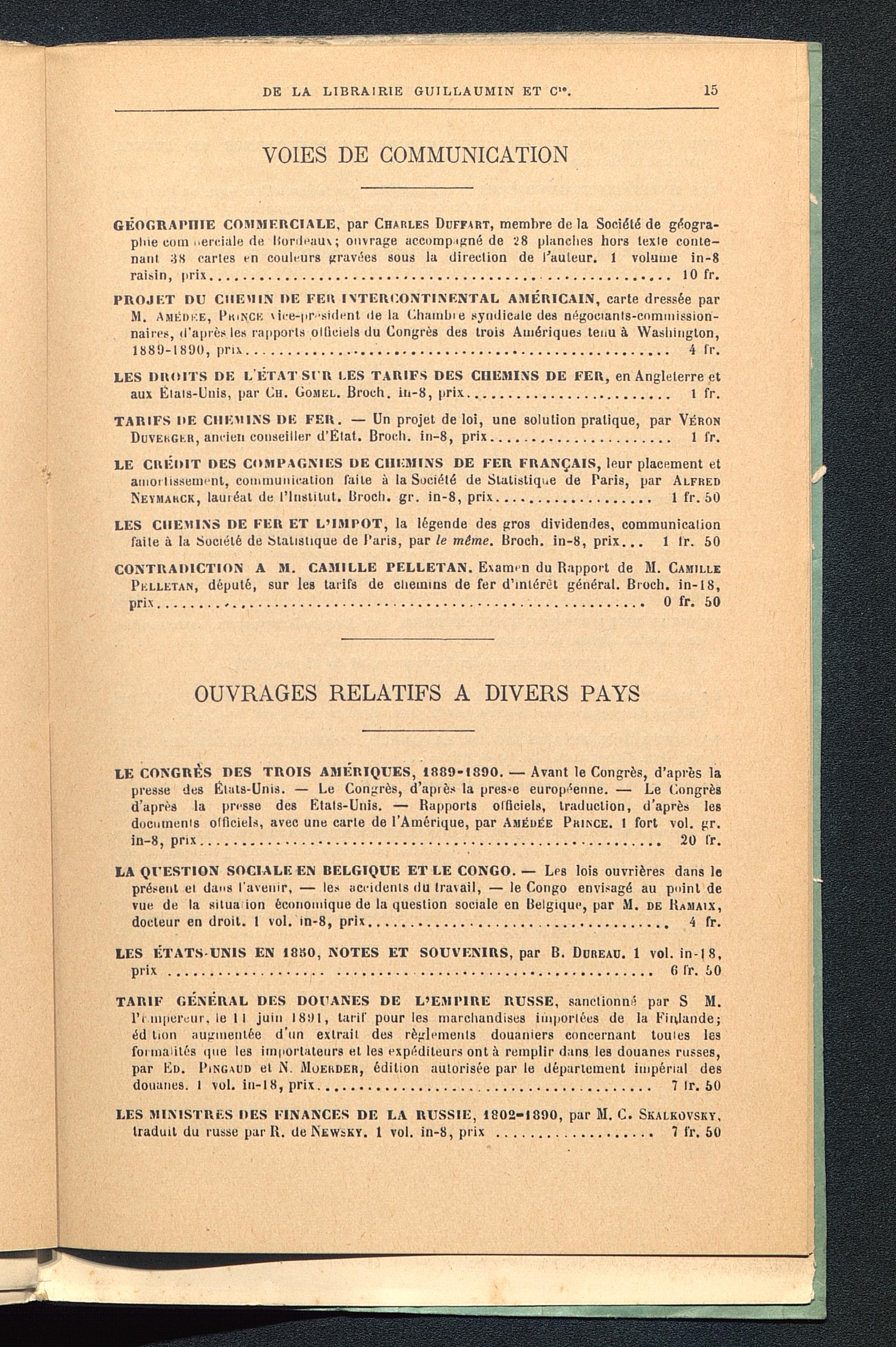 GÉOGRAPHIE COMMERCIALE, par Charles Duffvrt, membre delà Société de géogra-phie coin .>erciale de Bordeaux ; ouvrage accompagné de 78 planches hors texle conte-nanl SS cartes en couleurs gravées sous la direclion de l'auteur. 1 volume in-8raisin, prix... 10 fr.