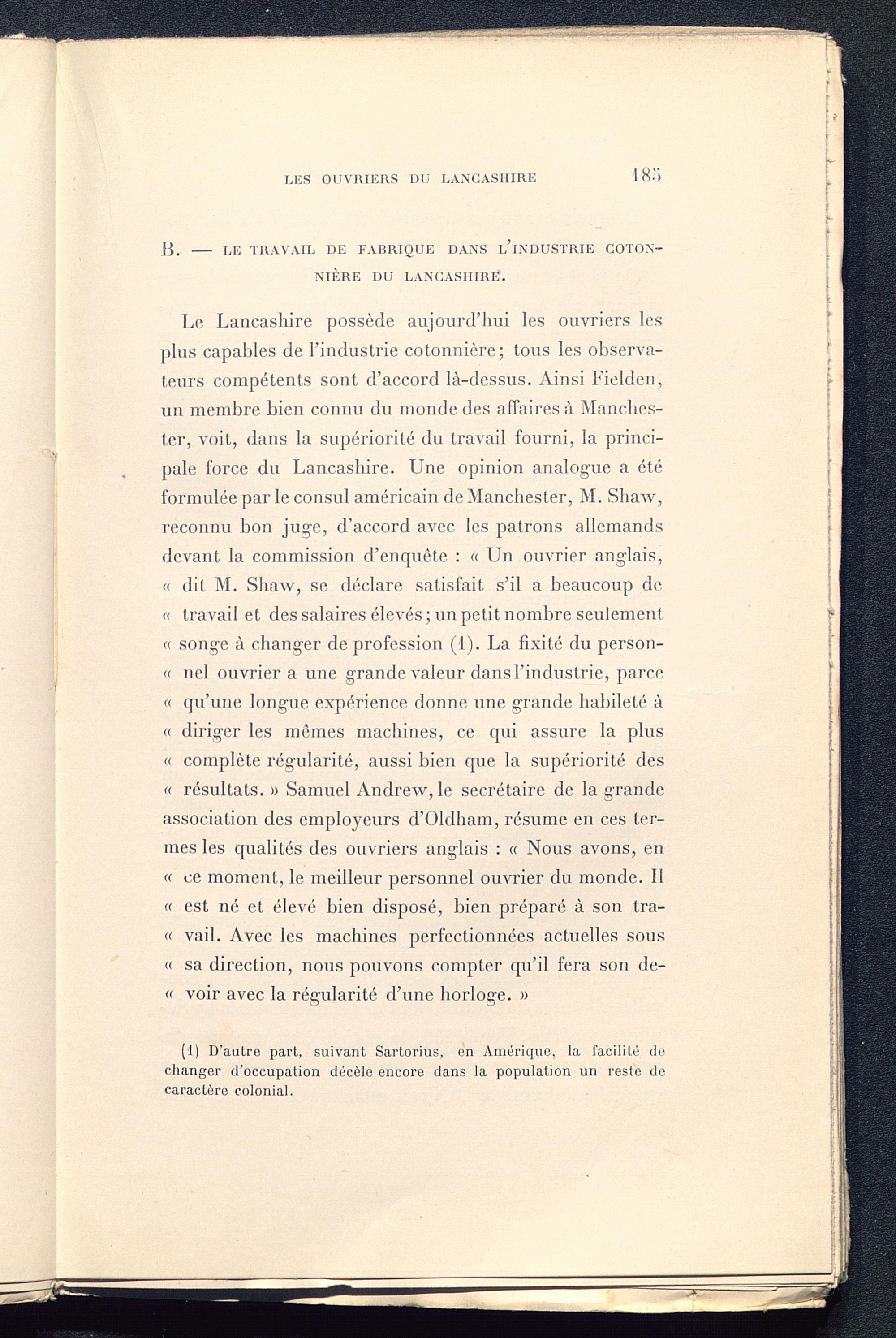 B. Le travail de fabrique dans l'industrie cotonnière du Lancashire