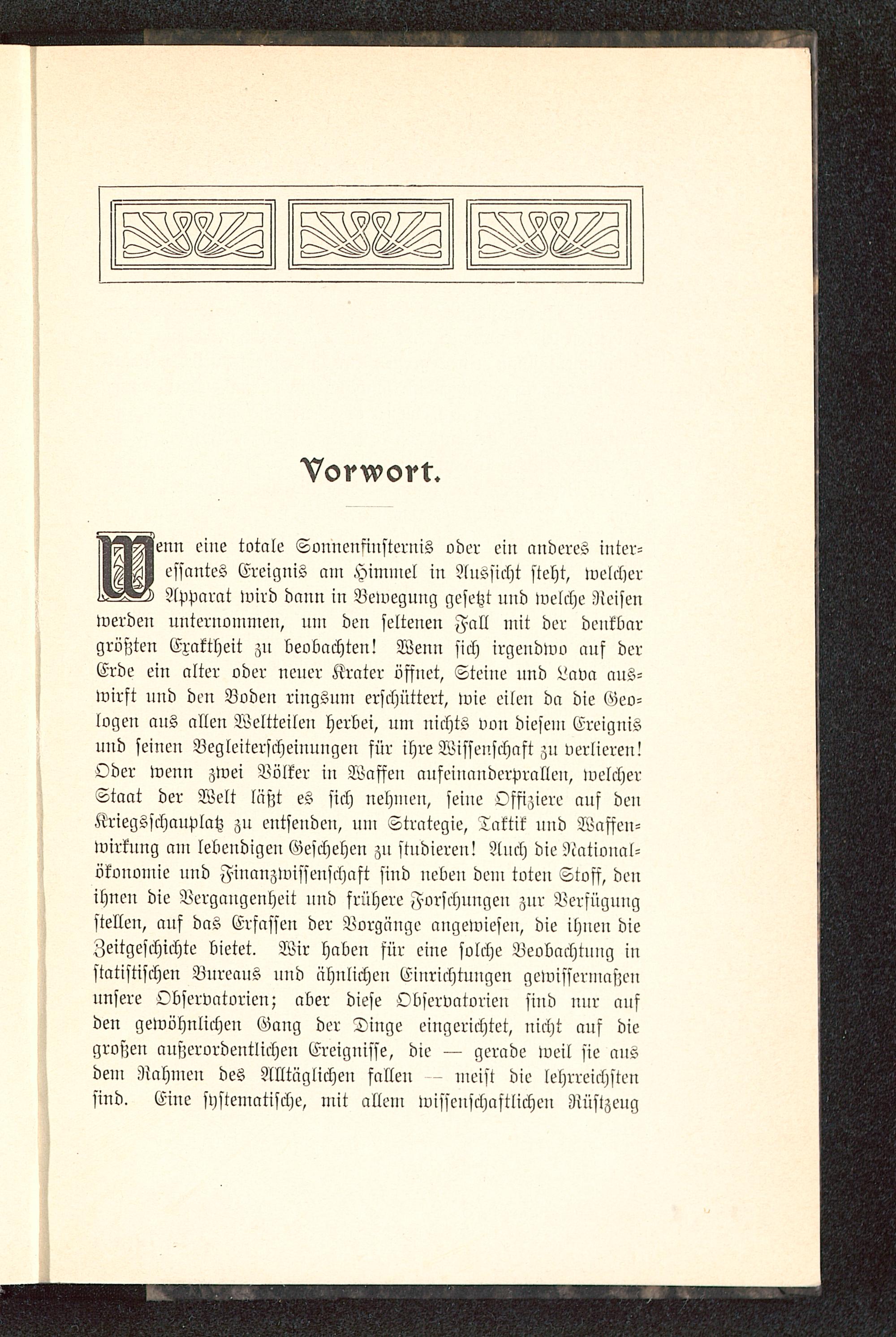 enn eine totale Sonnenfinsternis oder ein anderes inter-essantes Ereignis am Himmel in Aussicht steht, welcherApparat wird dann in Bewegung gesetzt und welche Reisenwerden unternommen, um den seltenen Fall mit der deutbargrößten Exaktheit zu beobachten! Wenn sich irgendwo auf derErde ein alter oder nener Krater öffnet, Steine und ^.'ava aus-wirft und den Boden ringsum? erschüttert, wie eileu da die Geo-logen ans allen Weltteilen herbei, nm nichts von diesem Ereignisund seinen Begleiterscheinungen für ihre Wissenschaft zu verlieren!Oder wenn zwei Völker in Waffen anfeinanderprallen, welcherStaat der Welt läßt es sich nehmen, seine Offiziere ans denKriegsschauplatz zu eutseudeu, um Strategie, Taktik und Waffen-wirkuug am lebendigen Geschehen zu studieren! Anch die National-ökonomie nnd Unanzwisseuschaft sind neben dem toten Stoff, denihnen die Vergangenheit nnd frühere Forschungen znr Perfügungstellen, auf das Erfassen der Vorgänge angewiesen, die ihnen dieZeitgeschichte bietet. Wir haben für eine solche Beobachtimg instatistischen Bureaus nnd ähnlichen Einrichtnngen gewissermaßenunsere Observatorien; aber diese Observatorien sind nur aufden gewöhulicheu Gaug der Diuge eingerichtet, nicht anf diegroßen außerordentlichen Ereiguisse, die — gerade weil sie ausdem Rahmen des Alltäglichen fallen meist die lehrreichstensind. Eine systematische, mit allem wisscnschastlichen Rüstzeug