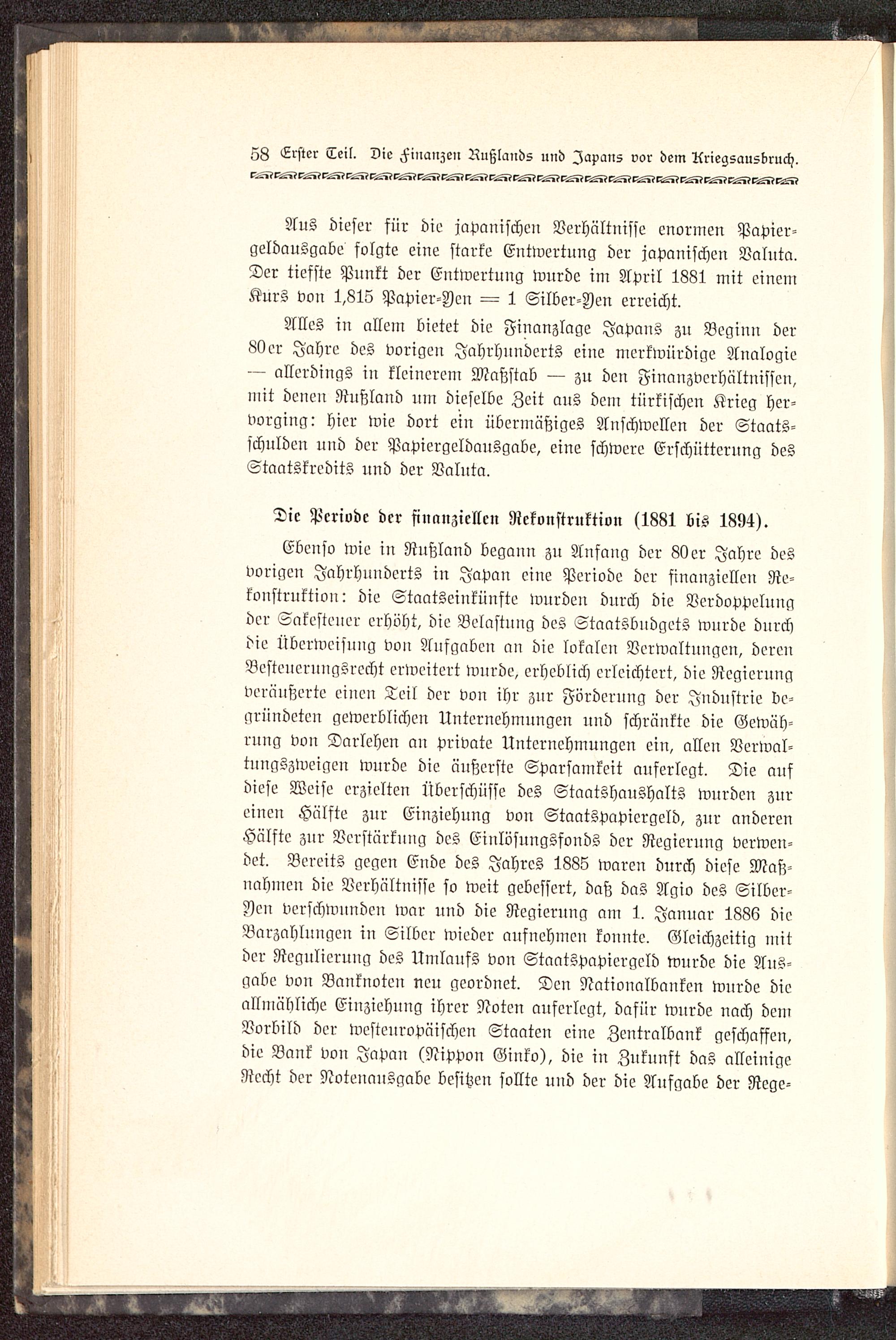 Ebenso wie in Rußland begauu zu Anfang der 80 er Jahre desvorigen Jahrhunderts in Japan eine Periode der finanziellen Re-konstruktion: die Staatseinkünfte wurden durch die Verdoppelungder Sakestener erhöht, die Belastnng des Staatsbudgets wurde durchdie Überweisung von Aufgaben an die lokalen Verwaltungen, derenBestenernngsrccht erweitert wurde, erheblich erleichtert, die Regierungveräußerte einen Teil der von ihr znr Förderung der Industrie be-gründeten gewerblichen Unternehmungen und schränkte die Gewäh-rung von Darlehen an private Unternehmungen ein, allen Verwal-tuugszweigen wurde die äußerste Sparsamkeit auferlegt. Die aufdiese Weise erzielten Überschüsse des Staatshaushalts wurden zureinen Hälfte zur Einziehung von Staatspapicrgeld, zur anderenHälfte zur Verstärkung des Einlösungsfonds der Negierung verwen-det. Bereits gegen Ende des Jahres 1885 waren durch diese Maß-nahmen die Verhältnisse so weit gebessert, daß das Agio des Silber-Jen verschwunden war und die Negierung am 1. Januar 1886 dieBarzahlungen in Silber wieder aufnehmen konnte. Gleichzeitig mitder Regulieruug des Umlaufs vou Staatspapiergcld wurde die Aus-gabe vou Banknoten neu geordnet. Den Nationalbankeu wurde dieallmähliche Einziehung ihrer Noten auferlegt, dafür wurde nach deinVorbild der westeuropäischen Staaten eine Zentralbank geschaffen,die Bank von Japan (Nippon Ginlo), die in Zukunft das alleinigeRecht der Notenausgabe besitzen sollte uud der die Ausgabe der Rege-