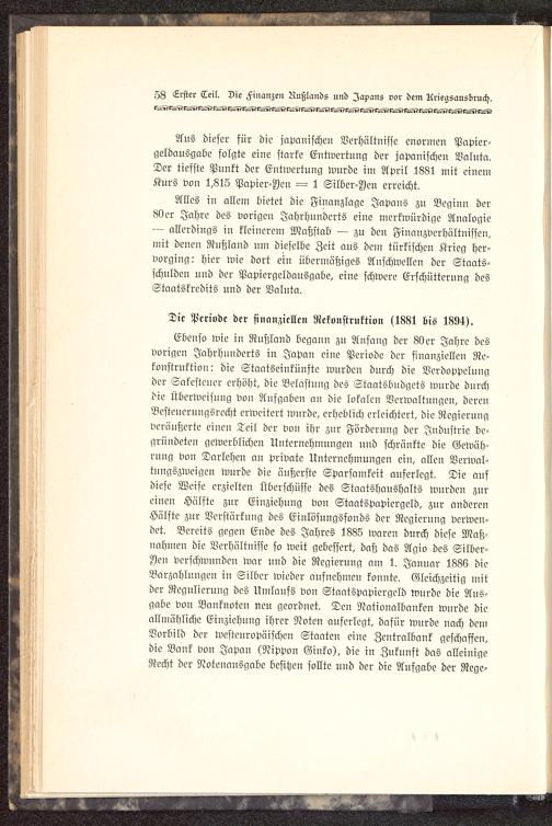 Alles in allem bietet die Finanzlage Japans zu Begiun der80 er Jahre des vorigen Jahrhunderts eiue merkwürdige Analogie— allerdings in kleinerem Maßstab — zu den Finanzvcrhältnissen,mit denen Rußland um dieselbe Zeit aus dein türkischen Krieg her-vorging: hier wie dort eiu übermäßiges Anschwellen der Staats-schulden und der Papiergeldausgabe, eine schwere Erschütterung desStaatskredits und der Valuta.