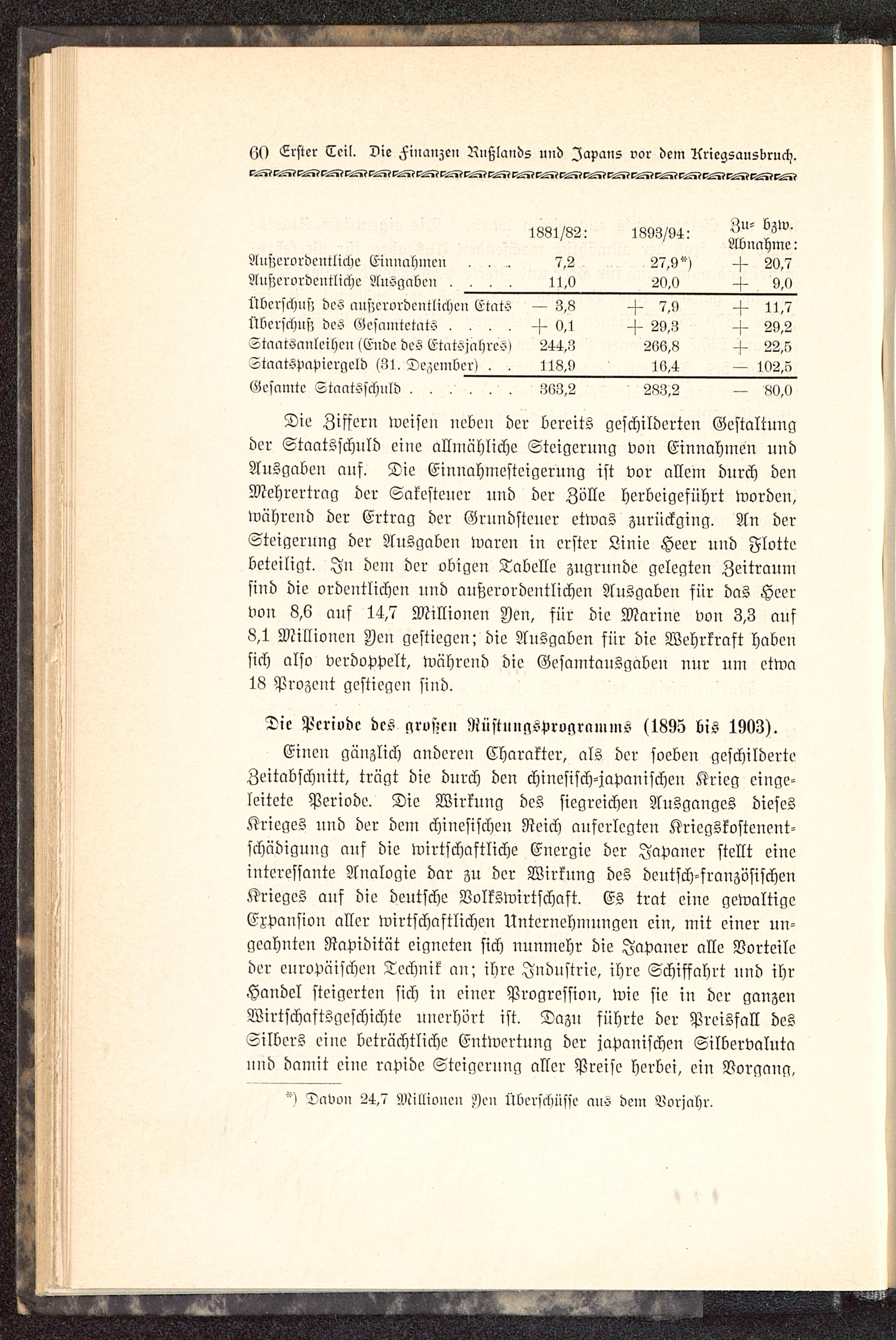 Die Ziffern weisen neben der bereits geschilderten Gestaltungder Staatsschuld eine allmähliche Steigerung von Einnahmen nndAusgaben auf. Die Einnahmesteigerung ist vor allem durch denMehrcrtrag der Sakestcuer uud der Zölle herbeigeführt worden,während der Ertrag der Grundsteuer etwas zurückging. An derSteigerung der Ausgaben waren in erster Linie Heer und Flottebeteiligt. Ju dem der obigen Tabelle zugrunde gelegten Zeitraumsind die ordentlichen und auszerordeutlichen Ausgaben sür das Heervon 8,6 ans 14,7 Millionen Jen, für die Marine von 3,3 auf8,1 Milliouen Jen gestiegen! die Ausgaben für die Wehrkraft habensich also verdoppelt, während die Gesamtansgaben nur um etwa18 Prozent gestiegen sind.