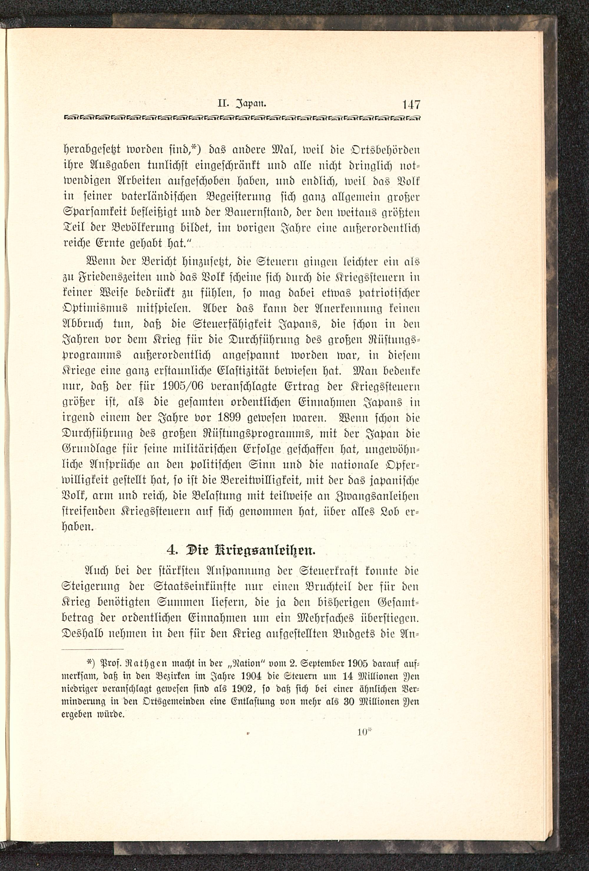 herabgesetzt worden sind,") das andere Mal, weil die Ortsbehördenihre Ausgaben tunlichst eingeschränkt und alle uicht dringlich notwendigen Arbeiten aufgeschoben haben, und endlich, weil das Volkin seiner vaterländischen Begeisterung sich ganz allgemein großerSparsamkeit befleißigt und der Bauernstand, der den weitaus größtenTeil der Bevölkerung bildet, im vorigen Jahre eine außerordentlichreiche Ernte gehabt hat."