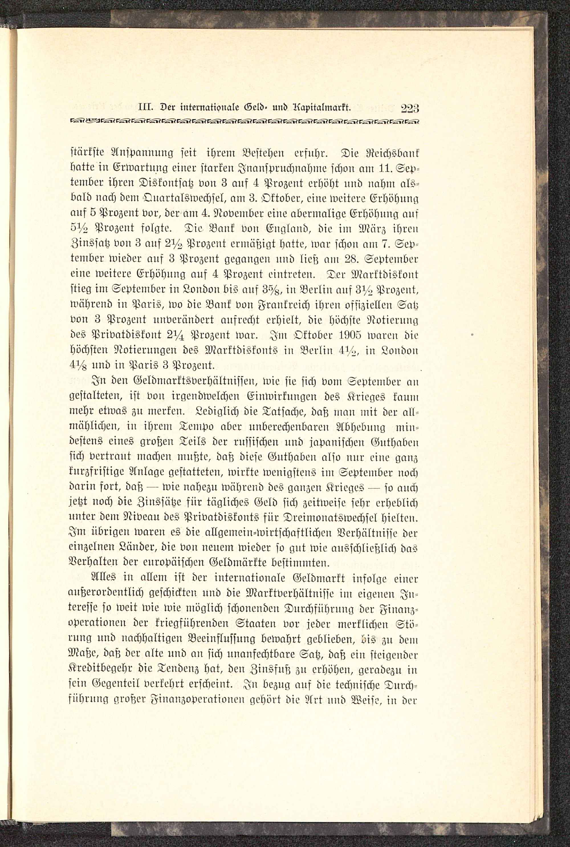 In den Geldmarktsverhältnissen, wie sie sich vom September angestalteten, ist von irgendwelchen Einwirkungen des Krieges kaummehr etwas zu merken. Lediglich die Tatsache, daß man mit der all-mählichen, in ihrem Tempo aber unberechenbaren Abhebung mimdestens eines großen Teils der russischen nnd japanischen Guthabensich vertraut machen mußte, daß diese Guthaben also nur eine ganzkurzfristige Anlage gestatteten, wirkte wenigstens im September nochdarin fort, daß — wie nahezu während des gauzeu Krieges — so auchjetzt noch die Zinssätze für tägliches Geld sich zeitweise sehr erheblichunter dem Niveau des Privatdiskouts für Dreimonatslvechsel hielten.Im übrigen waren es die allgemein-wirtschaftlichen Verhältnisse dereinzelnen Länder, die von neuem wieder so gut wie ausschließlich da-?Verhalten der europäischen Geldmärkte bestimmten.