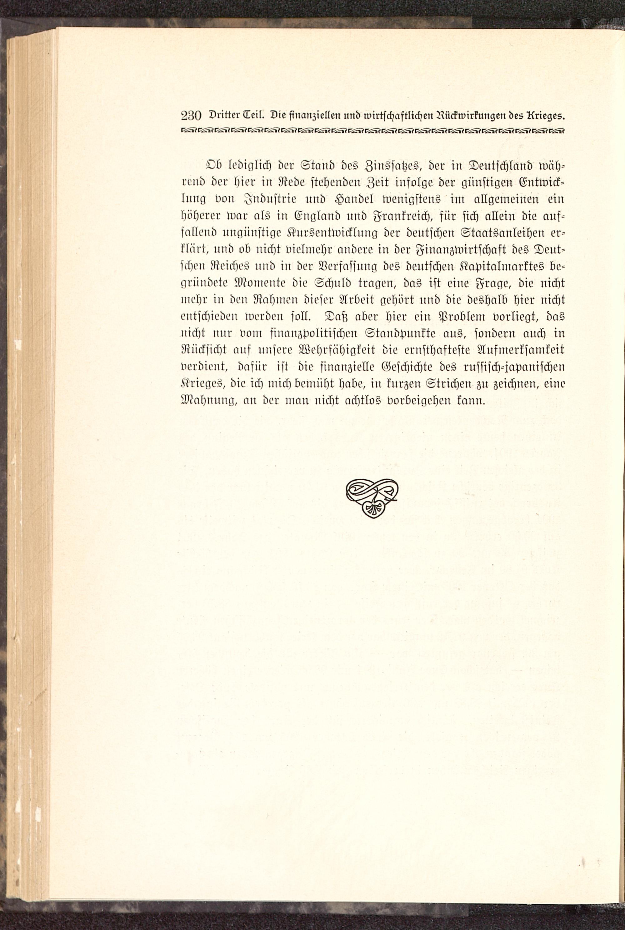 Ob lediglich der Stand des Zinssatzes, der in Deutschland wäh-rend der hier in Rede stehenden Zeit infolge der günstigen Entwick-lung von Industrie nnd Handel wenigstens im allgemeinen einhöherer war als in England nnd Frankreich , für sich allein die auf-fallend ungünstige Knrsentwickluug der deutschen Staatsanleihen er-klärt, und ob nicht vielmehr andere in der Finanzwirtschaft des Deut-scheu Reiches und in der Verfassung des deutschen Kapitalmarktes be-gründete Momente die Schuld tragen, das ist eine Frage, die nichtmehr in den Rahmen dieser Arbeit gehört nud die deshalb hier nichtentschieden werden soll. Daß aber hier ein Problem vorliegt, dasnicht mir vom finanzpolitischen Standpunkte aus, souderu auch inRücksicht ans unsere Wehrfähigkeit die ernsthafteste Aufmerksamkeitverdient, dafür ist die finanzielle Geschichte des russisch -japanischenKrieges, die ich mich bemüht habe, in kurzen Strichen zu zeichnen, eineMahnung, an der man nicht achtlos Vorbeigehen kann.