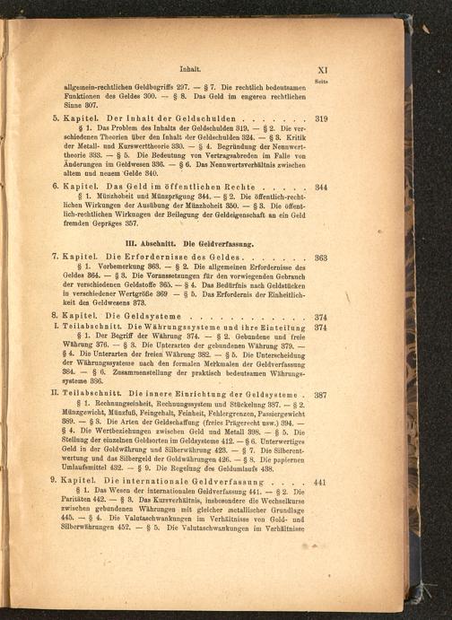 II. Teilabschnitt. Die innere Einrichtung der Geldsysteme . 387§ 1. Rechnungseinheit, Rechuungssystem und Stückelung 387. — § 2.Münzgewicht, Münzfuß, Feingehalt, Feinheit, Fehlergrenzen, Passiergewicht389. — § 3. Die Arten der Geldschaffung (freies Prägerecht usw.) 394. —§ 4. Die Wertbeziehungen zwischen Geld und Metall 398. — § 5. DieStellung der einzelnen Geldsorten im Geldsysteme 412. — § 6. UnterwertigesGeld in der Goldwährung und Silberwährung 423. — § 7. Die Silberent-wertung und das Silbergeid der Goldwährungen 426. — § 8. Die papicrnenUmlaufsmittel 432. — § 9. Die Regelung des Geldumlaufs 438.