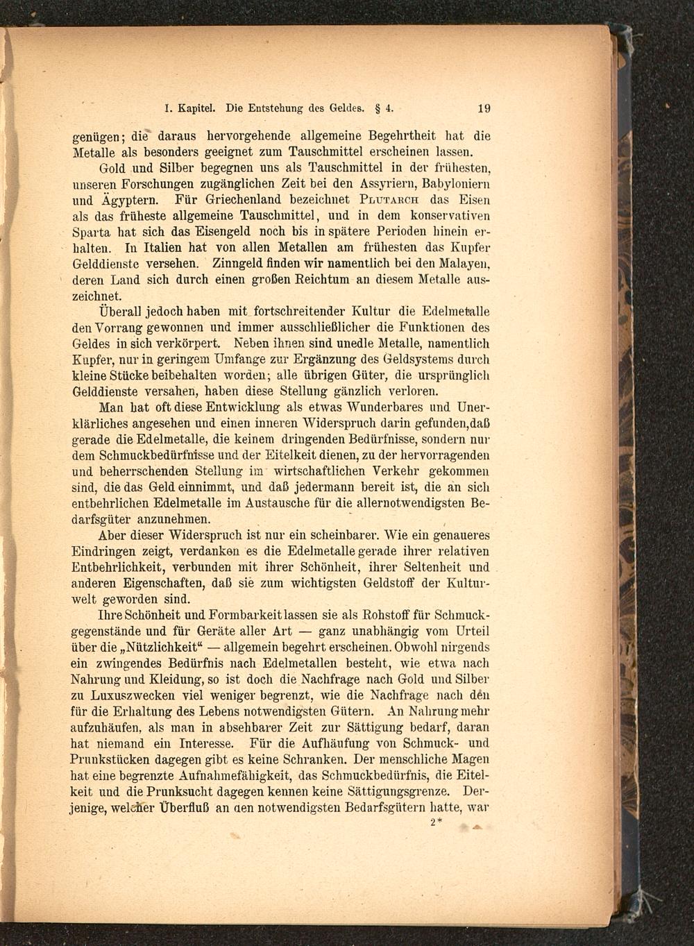Aber dieser Widerspruch ist nur ein scheinbarer. Wie ein genaueresEindringen zeigt, verdanken es die Edelmetalle gerade ihrer relativenEntbehrlichkeit, verbunden mit ihrer Schönheit, ihrer Seltenheit undanderen Eigenschaften, daß sie zum wichtigsten Geldstoff der Kultur-welt geworden sind.