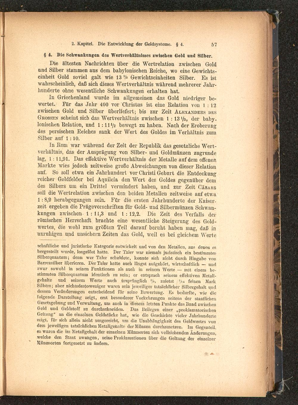 In Rom war während der Zeit der Republik das gesetzliche Wert-verhältnis, das der Ausprägung von Silber- und Goldmünzen zugrundelag, 1 11,91. Das effektive Wertverhältnis der Metalle auf dem offenenMarkte wies jedoch zeitweise große Abweichungen von dieser Relationauf. So soll etwa ein Jahrhundert vor Christi Geburt die Entdeckungreicher Goldfelder bei Aquileia den Wert des Goldes gegenüber demdes Silbers um ein Drittel vermindert haben, und zur Zeit Casarssoll die Wertrelation zwischen den beiden Metallen zeitweise auf etwa1:8,9 herabgegangen sein. Für die ersten Jahrhunderte der Kaiser-zeit ergeben die Prägevorsehriften für Gold- und Silbermünzen Schwan-kungen zwischen 1 : 11,3 und 1 : 12,2. Die Zeit des Verfalls derrömischen Herrschaft brachte eine wesentliche Steigerung des Gold-wertes, die wohl zum größten Teil darauf beruht haben mag, daß inunruhigen und unsichern Zeiten das Gold, weil es bei gleichem Werte