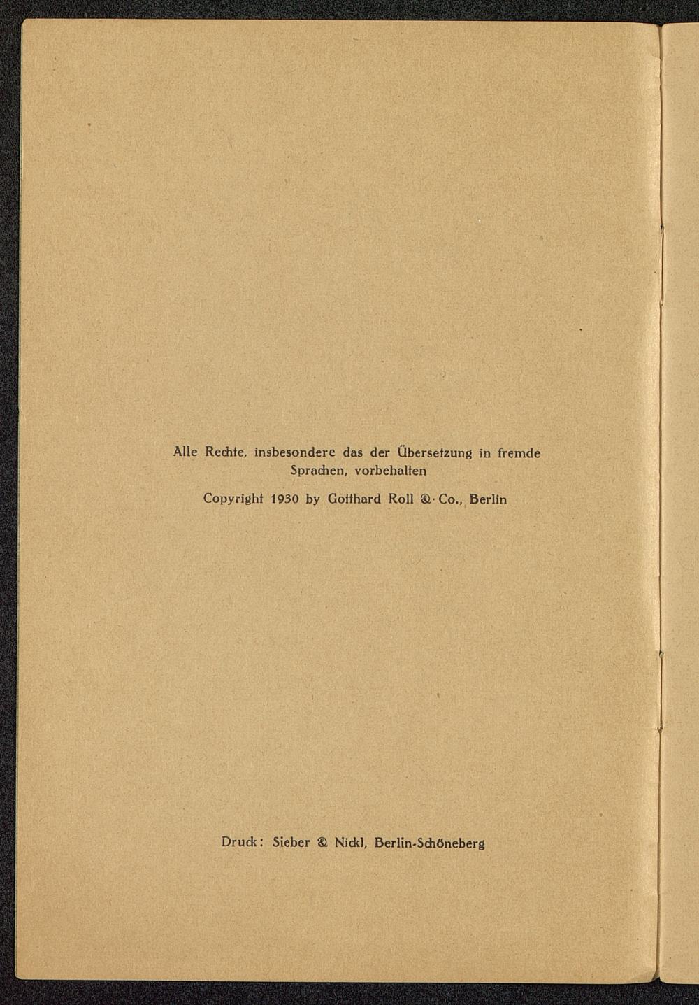 Alle Rechte, insbesondere das der Übersetzung in fremdeSprachen, vorbehaltenCopyright 1930 by Gotthard Roll &Co., Berlin Druck: Sieber ® Nicki, Berlin-Schöneberg