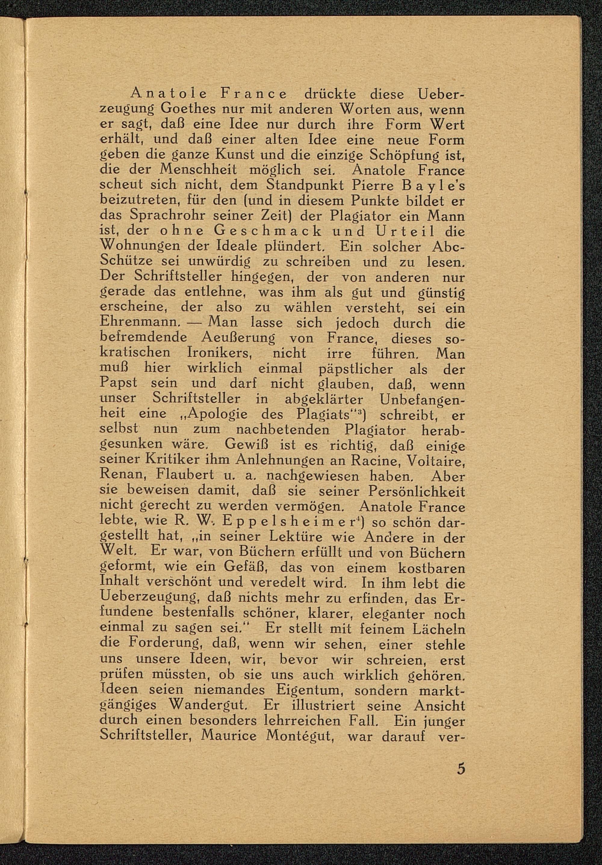 Anatole France drückte diese Ueber-zeugung Goethes nur mit anderen Worten aus, wenner sagt, daß eine Idee nur durch ihre Form Werterhält, und daß einer alten Idee eine neue Formgeben die ganze Kunst und die einzige Schöpfung ist,die der Menschheit möglich sei. Anatole France scheut sich nicht, dem Standpunkt Pierre B a y 1 e'sbeizutreten, für den (und in diesem Punkte bildet erdas Sprachrohr seiner Zeit) der Plagiator ein Mannist, der ohne Geschmack und Urteil dieWohnungen der Ideale plündert. Ein solcher Abc-Schütze sei unwürdig zu schreiben und zu lesen.Der Schriftsteller hingegen, der von anderen nurgerade das entlehne, was ihm als gut und günstigerscheine, der also zu wählen versteht, sei einEhrenmann. — Man lasse sich jedoch durch diebefremdende Aeußerung von France , dieses so-matischen Ironikers, nicht irre führen. Manmuß hier wirklich einmal päpstlicher als derPapst sein und darf nicht glauben, daß, wennunser Schriftsteller in abgeklärter Unbefangen-heit eine „Apologie des Plagiats" 3 ) schreibt, erselbst nun zum nachbetenden Plagiator herab-gesunken wäre. Gewiß ist es richtig, daß einigeseiner Kritiker ihm Anlehnungen an Racine, Voltaire ,Renan, Flaubert u. a. nachgewiesen haben. Abersie beweisen damit, daß sie seiner Persönlichkeitnicht gerecht zu werden vermögen. Anatole France lebte, wie R. W-. Eppelsheimer 4 ) so schön dar-gestellt hat, „in seiner Lektüre wie Andere in derWelt. Er war, von Büchern erfüllt und von Bücherngeformt, wie ein Gefäß, das von einem kostbarenInhalt verschönt und veredelt wird. In ihm lebt dieUeberzeugung, daß nichts mehr zu erfinden, das Er-fundene bestenfalls schöner, klarer, eleganter nocheinmal zu sagen sei." Er stellt mit feinem Lächelndie Forderung, daß, wenn wir sehen, einer stehleuns unsere Ideen, wir, bevor wir schreien, erstprüfen müssten, ob sie uns auch wirklich gehören.Ideen seien niemandes Eigentum, sondern markt-gängiges Wandergut. Er illustriert seine Ansichtdurch einen besonders lehrreichen Fall. Ein jungerSchriftsteller, Maurice Montegut, war darauf ver-