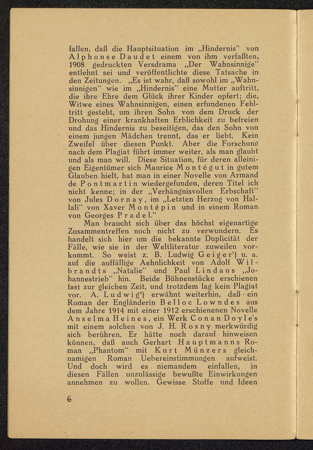 fallen, daß die Hauptsituation im „Hindernis" vonAlphonse Daudet einem von ihm verfaßten,1908 gedruckten Versdrama „Der Wahnsinnige"entlehnt sei und veröffentlichte diese Tatsache inden Zeitungen. „Es ist wahr, daß sowohl im „Wahn-sinnigen" wie im „Hindernis" eine Mutter auftritt,die ihre Ehre dem Glück ihrer Kinder opfert; die,Witwe eines Wahnsinnigen, einen erfundenen Fehl-tritt gesteht, um ihren Sohn von dem Druck derDrohung einer krankhaften Erblichkeit zu befreienund das Hindernis zu beseitigen, das den Sohn voneinem jungen Mädchen trennt, das er liebt. KeinZweifel über diesen Punkt. Aber die Forschungnach dem Plagiat führt immer weiter, als man glaubtund als man will. Diese Situation, für deren alleini-gen Eigentümer sich Maurice Montegut in gutemGlauben hielt, hat man in einer Novelle von Armandde Pontmartin wiedergefunden, deren Titel ichnicht kenne; in der „Verhängnisvollen Erbschaft"von Jules D o r n a y , im „Letzten Herzog von Hal-lali" von Xaver Montepin und in einem Romanvon Georges Prade 1."