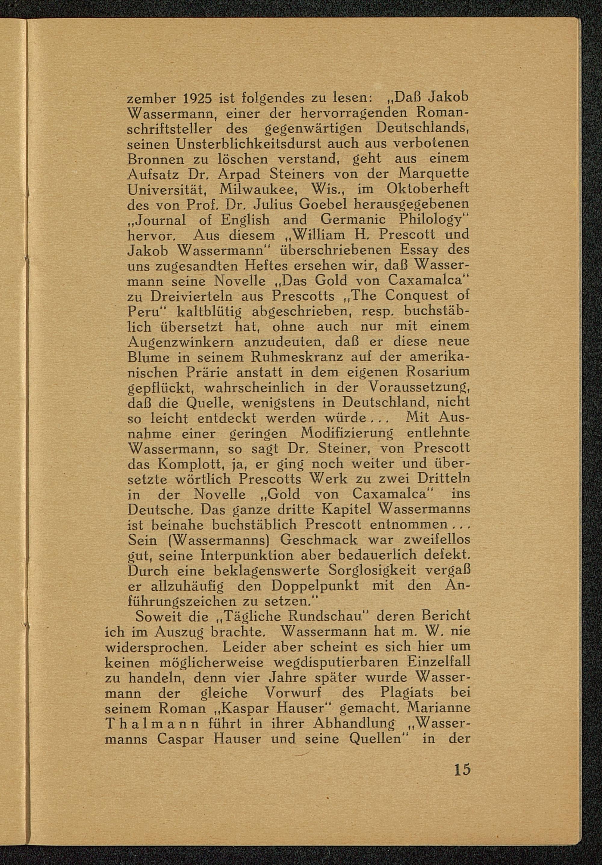 zember 1925 ist folgendes zu lesen: „Daß JakobWassermann , einer der hervorragenden Roman-schriftsteller des gegenwärtigen Deutschlands ,seinen Unsterblichkeitsdurst auch aus verbotenenBronnen zu löschen verstand, geht aus einemAufsatz Dr. Arpad Steiners von der MarquetteUniversität, Milwaukee , Wis., im Oktoberheftdes von Prof. Dr. Julius Goebel herausgegebenen„Journal of English and Germanic Philology"hervor. Aus diesem „William H. Prescott undJakob Wassermann " überschriebenen Essay desuns zugesandten Heftes ersehen wir, daß Wasser-mann seine Novelle „Das Gold von Caxamalca "zu Dreivierteln aus Prescotts „The Conquest ofPeru" kaltblütig abgeschrieben, resp. buchstäb-lich übersetzt hat, ohne auch nur mit einemAugenzwinkern anzudeuten, daß er diese neueBlume in seinem Ruhmeskranz auf der amerika-nischen Prärie anstatt in dem eigenen Rosariumgepflückt, wahrscheinlich in der Voraussetzung,daß die Quelle, wenigstens in Deutschland , nichtso leicht entdeckt werden würde . . . Mit Aus-nahme einer geringen Modifizierung entlehnteWassermann, so sagt Dr. Steiner, von Prescottdas Komplott, ja, er ging noch weiter und über-setzte wörtlich Prescotts Werk zu zwei Drittelnin der Novelle „Gold von Caxamalca " insDeutsche. Das ganze dritte Kapitel Wassermannsist beinahe buchstäblich Prescott entnommen . . .Sein (Wassermanns) Geschmack war zweifellosgut, seine Interpunktion aber bedauerlich defekt.Durch eine beklagenswerte Sorglosigkeit vergaßer allzuhäufig den Doppelpunkt mit den An-führungszeichen zu setzen."Soweit die „Tägliche Rundschau" deren Berichtich im Auszug brachte. Wassermann hat m. W. niewidersprochen. Leider aber scheint es sich hier umkeinen möglicherweise wegdisputierbaren Einzelfallzu handeln, denn vier Jahre später wurde Wasser-mann der gleiche Vorwurf des Plagiats beiseinem Roman „Kaspar Hauser " gemacht. MarianneT h a 1 m a n n führt in ihrer Abhandlung „Wasser-manns Caspar Hauser und seine Quellen" in der