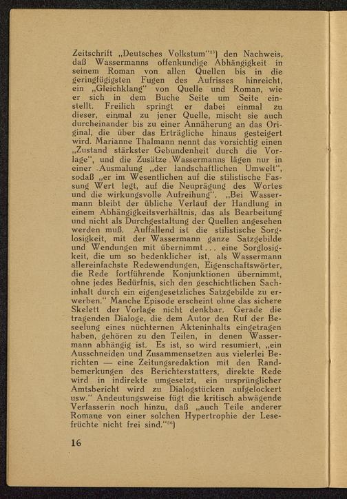 Zeitschrift „Deutsches Volkstum"'") den Nachweis,daß Wassermanns offenkundige Abhängigkeit inseinem Roman von allen Quellen bis in diegeringfügigsten Fugen des Aufrisses hinreicht,ein „Gleichklang" von Quelle und Roman, wieer sich in dem Buche Seite um Seite ein-stellt. Freilich springt er dabei einmal zudieser, einmal zu jener Quelle, mischt sie auchdurcheinander bis zu einer Annäherung an das Ori-ginal, die über das Erträgliche hinaus gesteigertwird. Marianne Thalmann nennt das vorsichtig einen„Zustand stärkster Gebundenheit durch die Vor-lage", und die Zusätze Wassermanns lägen nur ineiner .Ausmalung „der landschaftlichen Umwelt",sodaß „er im Wesentlichen auf die stilistische Fas-sung Wert legt, auf die Neuprägung des Wortesund die wirkungsvolle Aufreihung". „Bei Wasser-mann bleibt der übliche Verlauf der Handlung ineinem Abhängigkeitsverhältnis, das als Bearbeitungund nicht als Durchgestaltung der Quellen angesehenwerden muß. Auffallend ist die stilistische Sorg-losigkeit, mit der Wassermann ganze Satzgebildeund Wendungen mit übernimmt. . . eine Sorglosig-keit, die um so bedenklicher ist, als Wassermannallereinfachste Redewendungen, Eigenschaftswörter,die Rede fortführende Konjunktionen übernimmt,ohne jedes Bedürfnis, sich den geschichtlichen Sach-inhalt durch ein eigengesetzliches Satzgebilde zu er-werben." Manche Episode erscheint ohne das sichereSkelett der Vorlage nicht denkbar. Gerade dietragenden Dialoge, die dem Autor den Ruf der Be-seelung eines nüchternen Akteninhalts eingetragenhaben, gehören zu den Teilen, in denen Wasser-mann abhängig ist. Es ist, so wird resümiert, „einAusschneiden und Zusammensetzen aus vielerlei Be-richten — eine Zeitungsredaktion mit den Rand-bemerkungen des Berichterstatters, direkte Redewird in indirekte umgesetzt, ein ursprünglicherAmtsbericht wird zu Dialogstücken aufgelockertusw." Andeutungsweise fügt die kritisch abwägendeVerfasserin noch hinzu, daß „auch Teile andererRomane von einer solchen Hypertrophie der Lese-früchte nicht frei sind." 30 )