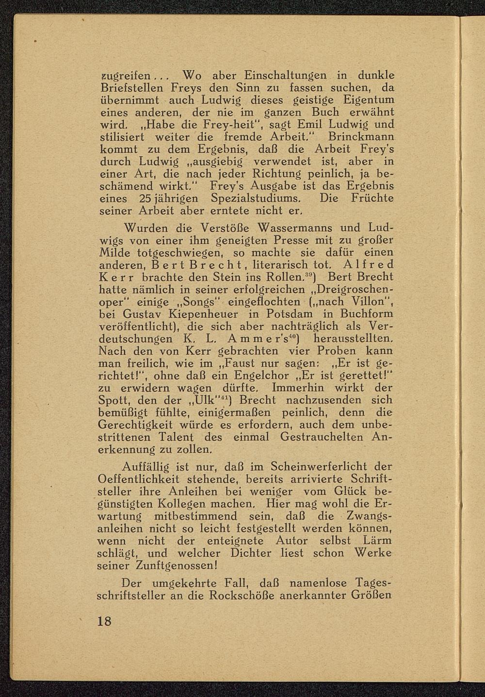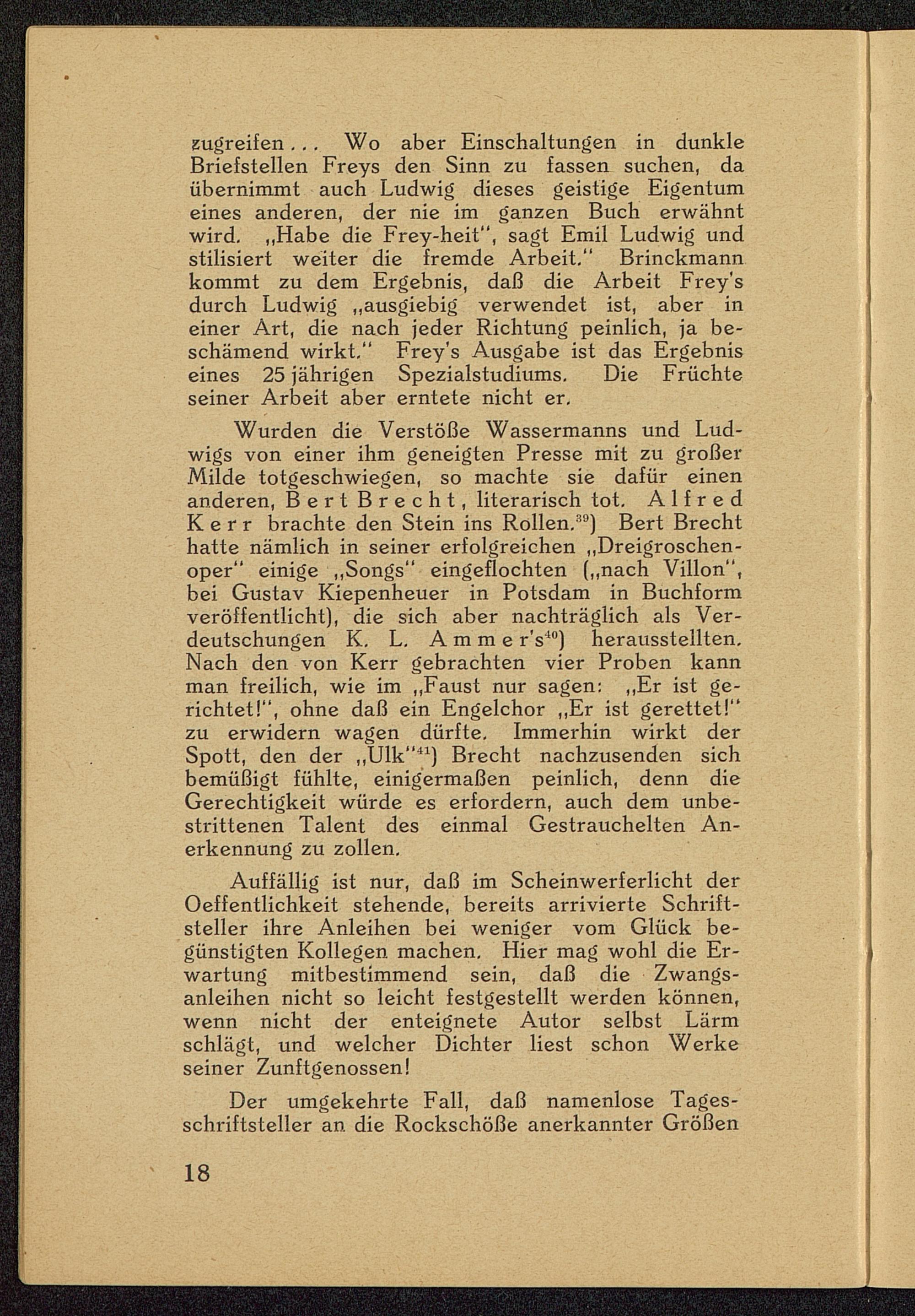 Wurden die Verstöße Wassermanns und Lud-wigs von einer ihm geneigten Presse mit zu großerMilde totgeschwiegen, so machte sie dafür einenanderen, Bert Brecht , literarisch tot. AlfredK e r r brachte den Stein ins Rollen. 39 ) Bert Brecht hatte nämlich in seiner erfolgreichen „Dreigroschen-oper" einige „Songs" eingeflochten („nach Villon ",bei Gustav Kiepenheuer in Potsdam in Buchformveröffentlicht), die sich aber nachträglich als Ver-deutschungen K. L. Amme r's J0 ) herausstellten.Nach den von Kerr gebrachten vier Proben kannman freilich, wie im „Faust nur sagen: „Er ist ge-richtet!", ohne daß ein Engelchor „Er ist gerettet!"zu erwidern wagen dürfte. Immerhin wirkt derSpott, den der „Ulk" 41 ) Brecht nachzusenden sichbemüßigt fühlte, einigermaßen peinlich, denn dieGerechtigkeit würde es erfordern, auch dem unbe-strittenen Talent des einmal Gestrauchelten An-erkennung zu zollen.