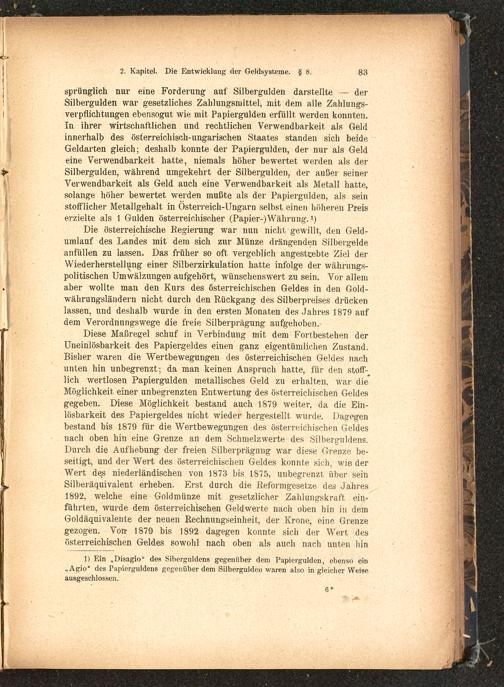 sprünglich nur eine Forderung auf Silbergulden darstellte — derSilbergulden war gesetzliches Zahlungsmittel, mit dem alle Zahlungs-verpflichtungen ebensogut wie mit Papiergulden erfüllt werden konnten.In ihrer wirtschaftlichen und rechtlichen Verwendbarkeit als Geldinnerhalb des österreichisch-ungarischen Staates standen sich beideGeldarten gleich; deshalb konnte der Papiergulden, der nur als Geldeine Verwendbarkeit hatte, niemals höher bewertet werden als derSilbergulden, während umgekehrt der Silbergulden, der außer seinerVerwendbarkeit als Geld auch eine Verwendbarkeit als Metall hatte,solange höber bewertet werden mußte als der Papiergulden, als seinstofflicher Metallgehalt in Österreich-Ungarn selbst einen höheren Preiserzielte als 1 Gulden österreichischer (Papier -)Währung.*)