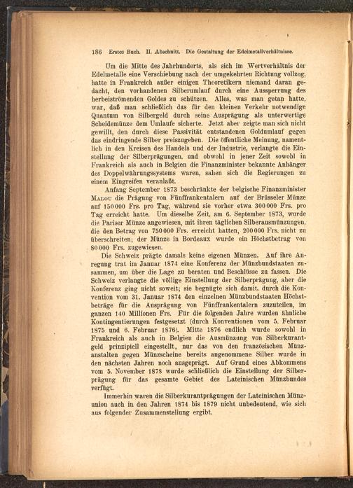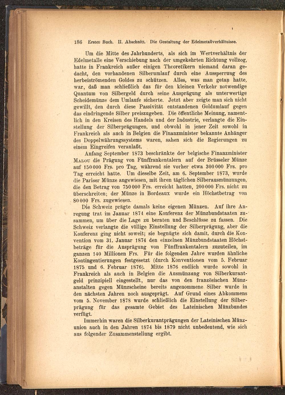 Anfang September 1873 beschränkte der belgische FinanzministerMalou die Prägung von Fünffrankentalern auf der Brüsseler Münzeauf 150 000 Frs. pro Tag, während sie vorher etwa 300 000 Frs. proTag erreicht hatte. Um dieselbe Zeit, am 6. September 1873, wurdedie Pariser Münze angewiesen, mit ihren täglichen Silberausmünzungen,die den Betrag von 750 000 Frs. erreicht hatten, 200 000 Frs. nicht zuüberschreiten; der Münze in Bordeaux wurde ein Höchstbetrag von80 000 Frs. zugewiesen.