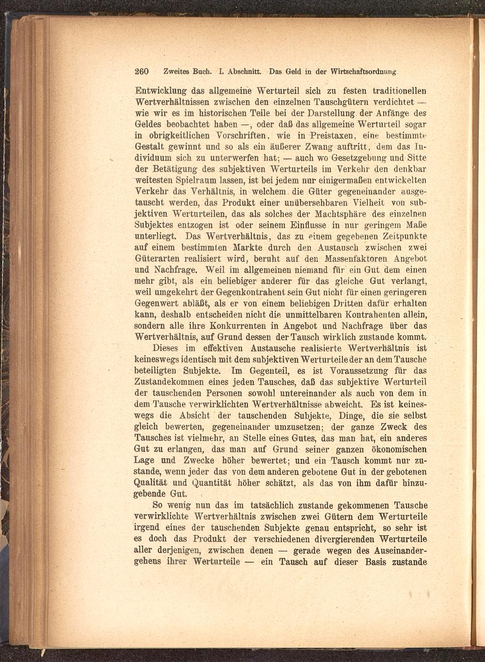 So wenig nun das im tatsächlich zustande gekommenen Tauscheverwirklichte Wertverhältnis zwischen zwei Gütern dem Werturteileirgend eines der tauschenden Subjekte genau entspricht, so sehr istes doch das Produkt der verschiedenen divergierenden Werturteilealler derjenigen, zwischen denen — gerade wegen des Auseinander-gehens ihrer Werturteile — ein Tausch auf dieser Basis zustande