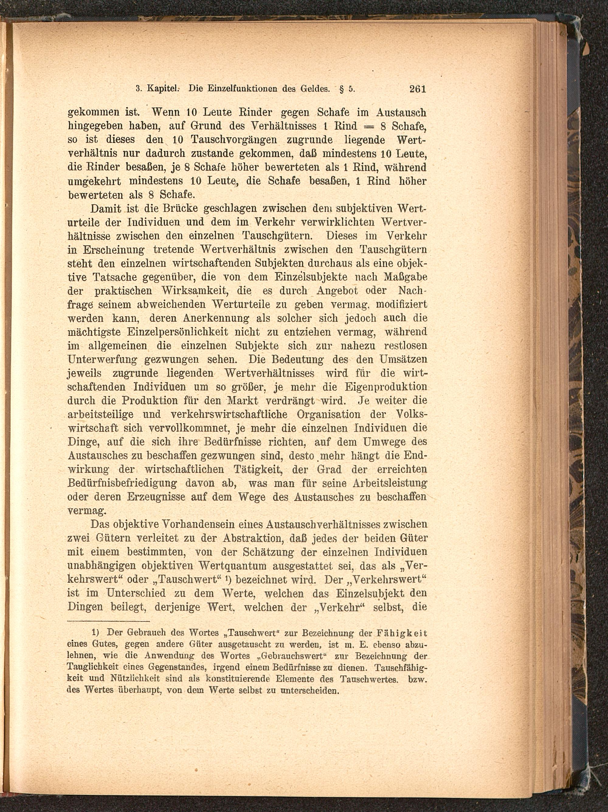 Das objektive Vorhandensein eines Austauschverhältnisses zwischenzwei Gütern verleitet zu der Abstraktion, daß jedes der beiden Gütermit einem bestimmten, von der Schätzung der einzelnen Individuenunabhängigen objektiven Wertquantum ausgestattet sei, das als „Ver-kehrswert" oder „Tauschwert"») bezeichnet wird. Der „Verkehrswert"ist im Unterschied zu dem Werte, welchen das Einzelsubjekt denDingen beilegt, derjenige Wert, welchen der „Verkehr" selbst, die
