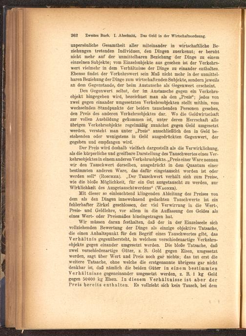 Mit dieser so einleuchtend klingenden Ableitung des Preises vondem als den Dingen innewohnend gedachten Tauschwerte ist einfehlerhafter Zirkel geschlossen, der viel Verwirrung in die Wert-,Preis- und Geldlehre, vor allem in die Auffassung des Geldes alseines Wert- oder Preismäßes hineingetragen hat.
