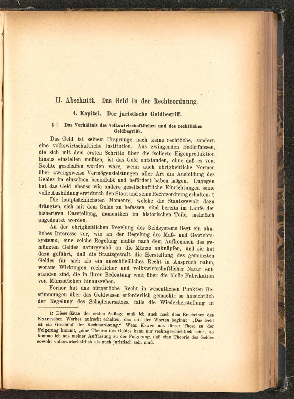 Das Geld ist seinem Ursprünge nach keine rechtliche, sonderneine volkswirtschaftliche Institution. Aus zwingenden Bedürfnissen,die sich mit dem ersten Schritte über die isolierte Eigenproduktionhinaus einstellen mußten, ist das Geld entstanden, ohne daß es vomRechte geschaffen worden wäre, wenn auch obrigkeitliche Normenüber zwangsweise Vermögensleistungen aller Art die Ausbildung desGeldes im einzelnen beeinflußt und befördert haben mögen. Dagegenhat das Geld ebenso wie andere gesellschaftliche Einrichtungen seinevolle Ausbildung erst durch den Staat und seine Rechtsordnung erhalten.')