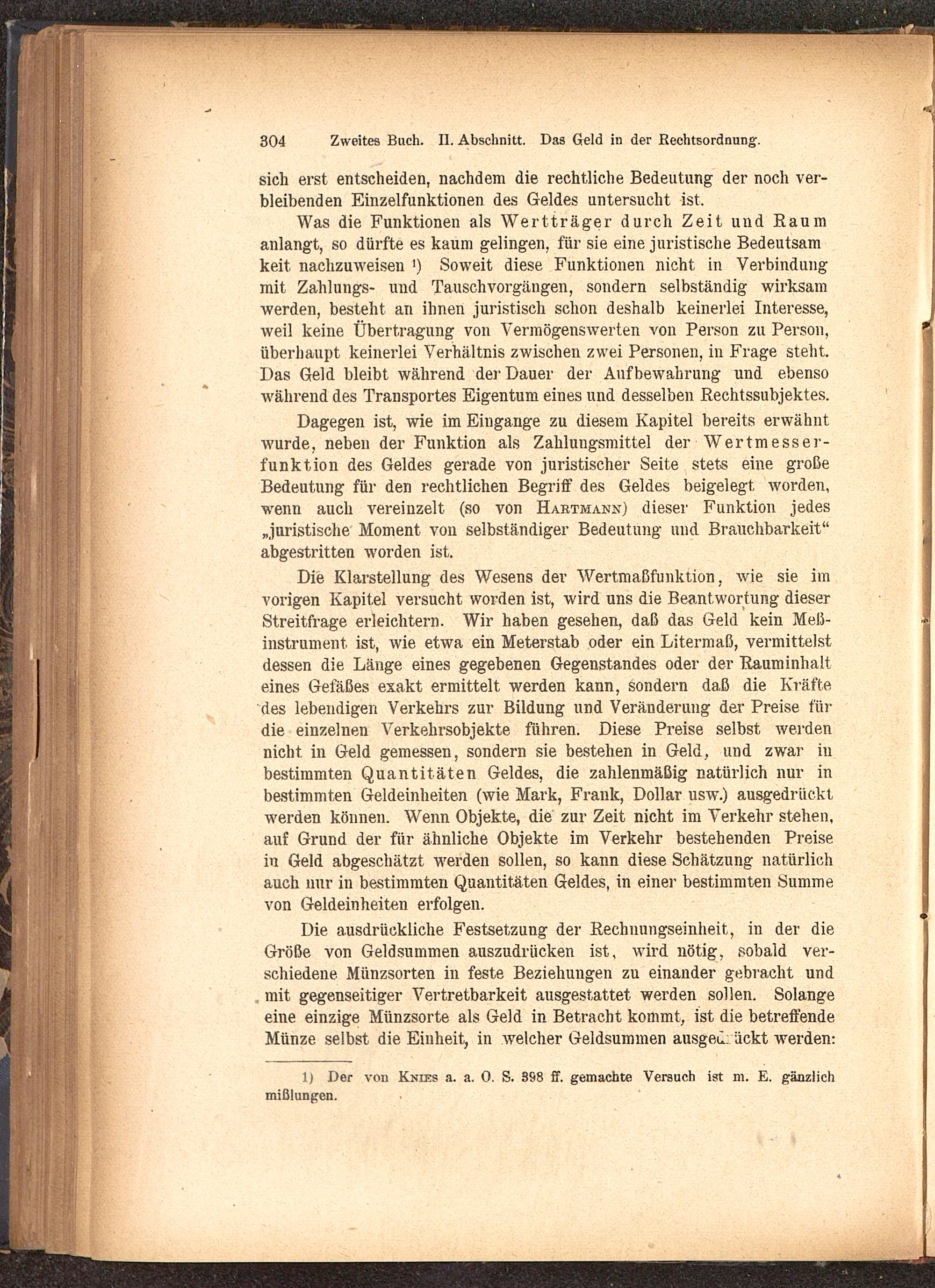 Dagegen ist, wie im Eingänge zu diesem Kapitel bereits erwähntwurde, neben der Funktion als Zahlungsmittel der Wertmesser-funktion des Geldes gerade von juristischer Seite stete eine großeBedeutung für den rechtlichen Begriff des Geldes beigelegt worden,wenn auch vereinzelt (so von Hartmann) dieser Funktion jedesJuristische Moment von selbständiger Bedeutung und Brauchbarkeit"abgestritten worden ist.
