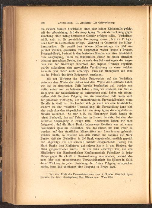Mit der Wirkung des freien Prägerechts auf das Verhältniszwischen dem Werte des Geldes und dem Werte des Geldstoffs habenwir uns im historischen Teile bereits beschäftigt und werden unsweiter unten noch zu befassen haben. »Hier, wo zunächst nur die Be-dingungen der Geldschaffung zu untersuchen sind, haben wir festzu-stellen, daß die freie Prägung nur ein besonderer Fall, wenn auchder praktisch wichtigste, der unbeschränkten Umwandelbarkeit einesMetalls in Geld ist. Es handelt sich ja nicht um eine tatsächliche,sondern um eine rechtliche Umwandlung; die Umwandlung kann sichalso auch ohne den körperlichen Akt der Ausprägung des eingeliefertenMetalls vollziehen. So war z. B. die Hamburger Mark Banko einreines Buchgeld, das auf Feinsilber in Barren beruhte, bei dem alsokeinerlei Ausprägung in Frage kam. Andrerseits haben wir obenfestgestellt, daß die Mark Banko keineswegs identisch war mit einembestimmten 1 Quantum Feinsilber; wie das Silber, um zum Taler zuwerden, auf den staatlichen Münzstätten zur Ausmünzung gebrachtwerden mußte, so entstand aus dem Silber nur dadurch die MarkBanko, daß das Feinsilber in die Bank eingebracht, amtlich geprüftund abgewägt und der seinem Gewichte entsprechende Betrag vonMark Banko dem Einlieferer auf seinem Konto in den Büchern derBank gutgeschrieben wurde. Da der Bank auferlegt war, von denMitgliedern der Hamburgischen Kaufmannschaft Feinsilber in jederMenge gegen Gutschrift in Bankowährung anzunehmen, bestand alsoauch hier eine unbeschränkte Umwandelbarkeit des Silbers in Geld,deren Wirkung in jeder Beziehung der freien Prägung entsprechenmußte, ohne daß überhaupt eine Prägung in Frage kam.