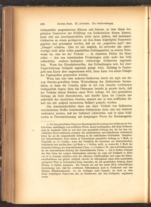 Wenn nun eine oder mehrere Geldsorten durch ein Agio aus dervom Gesetze gewollten festen Wertordnung des Geldsystems heraus-fallen, so kann die Ursache, nicht in der vom Gesetze verliehenenGeldqualität liegen; denn das Phänomen besteht ja gerade darin, daßder Verkehr diesen Stücken einen Wert beilegt, der ihre gesetzlicheGeltung als Geld überschreitet, und hierfür kann die Ursache nuraußerhalb der staatlichen Gesetze, zumeist nur in dem stofflichen Ge-halt des mit Aufgeld bewerteten Geldes 1 ) gesucht werden.