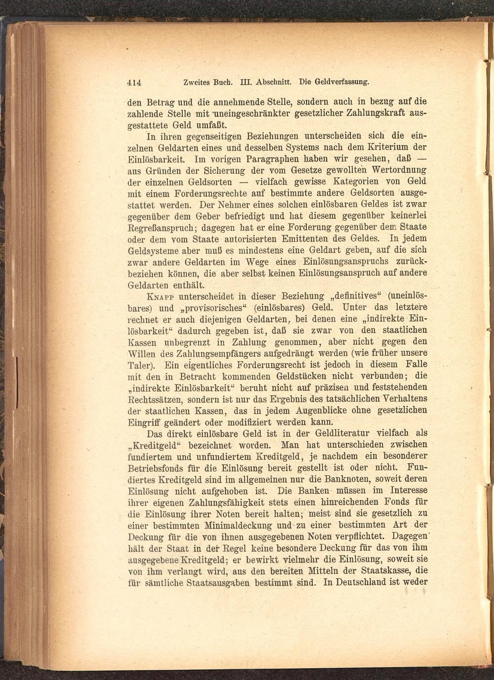Knapp unterscheidet in dieser Beziehung „definitives" (uneinlös-bares) und „provisorisches" (einlösbares) Geld. Unter das letztererechnet er auch diejenigen Geldarten, bei denen eine „indirekte Ein-lösbarkeit" dadurch gegeben ist, daß sie zwar von den staatlichenKassen unbegrenzt in Zahlung genommen, aber nicht gegen denWillen des Zahlungsempfängers aufgedrängt werden (wie früher unsereTaler). Ein eigentliches Forderungsrecht ist jedoch in diesem Fallemit den in Betracht kommenden Geldstücken nicht verbunden; die„indirekte Einlösbarkeit" beruht nicht auf präzisen und feststehendenRechtssätzen, sondern ist nur das Ergebnis des tatsächlichen Verhaltensder staatlichen Kassen, das in jedem Augenblicke ohne gesetzlichenEingriff geändert oder modifiziert werden kann.