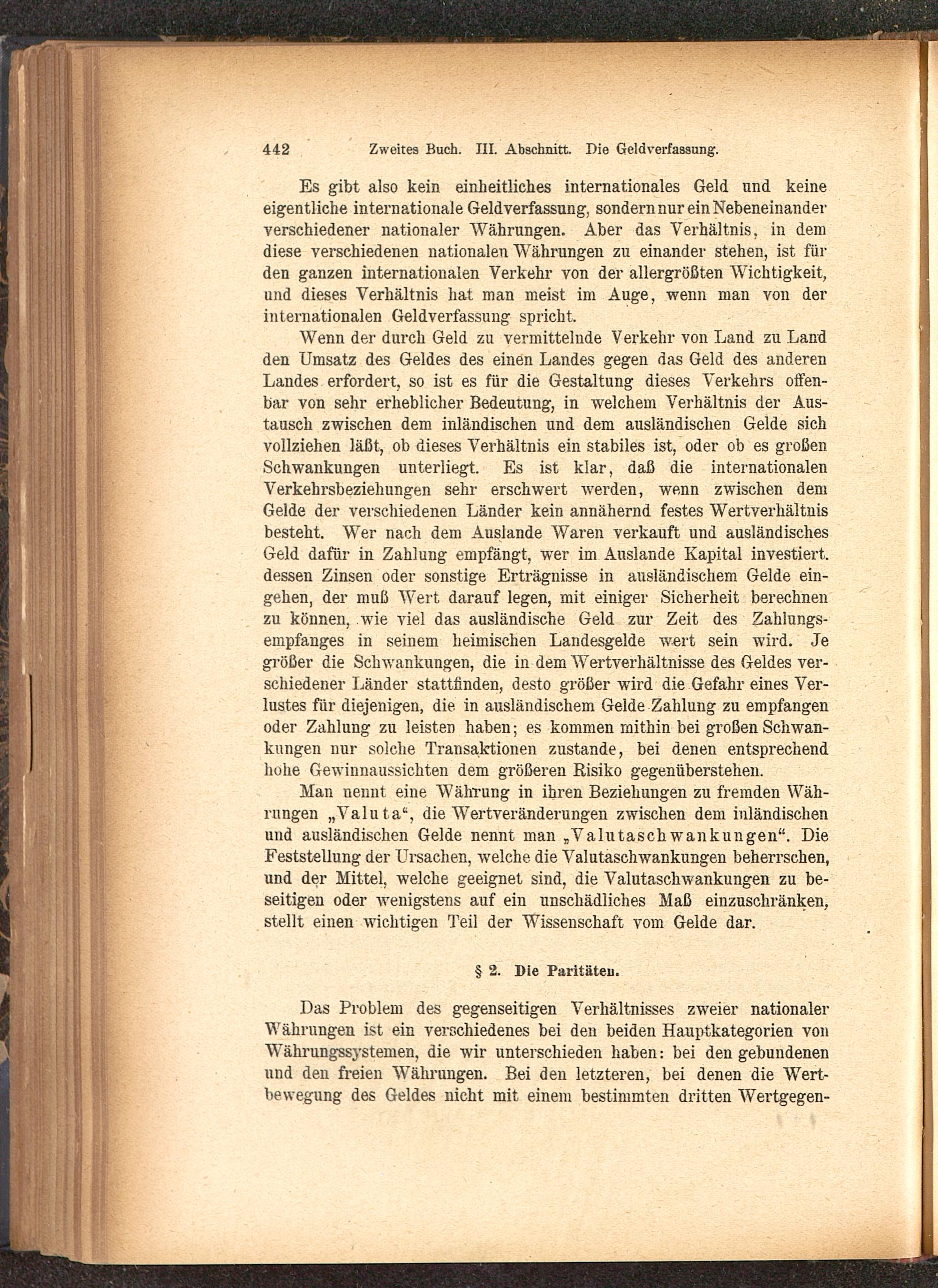 Es gibt also kein einheitliches internationales Geld und keineeigentliche internationale Geldverfassung, sondern nur ein Nebeneinanderverschiedener nationaler Währungen. Aber das Verhältnis, in demdiese verschiedenen nationalen Währungen zu einander stehen, ist fin-den ganzen internationalen Verkehr von der allergrößten Wichtigkeit,und dieses Verhältnis hat man meist im Auge, wenn man von derinternationalen Geldverfassung spricht.